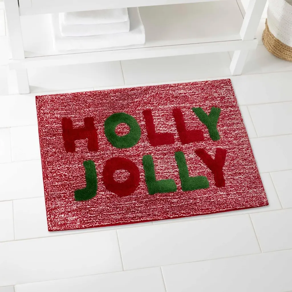 The Avanti Holly Jolly Decorative Bathroom Rug features "HOLLY JOLLY" in an upper-case festive, holiday font in alternating red and green. The ground is red and white mingled together for a textured look. Tufted of 100% polyester for easy care and brilliant colors. 20" x 32" with non-skid back.