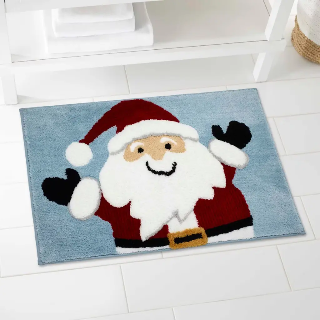 The Avanti Santa Decorative Bathroom Rug features a smiling Santa with outstretched arms in red, black and white on a light blue ground. Tufted of 100% polyester for easy care, brilliant colors. 20" x 32" with non-skid back. Adds a colorful holiday touch to any bathroom, kitchen or entryway.