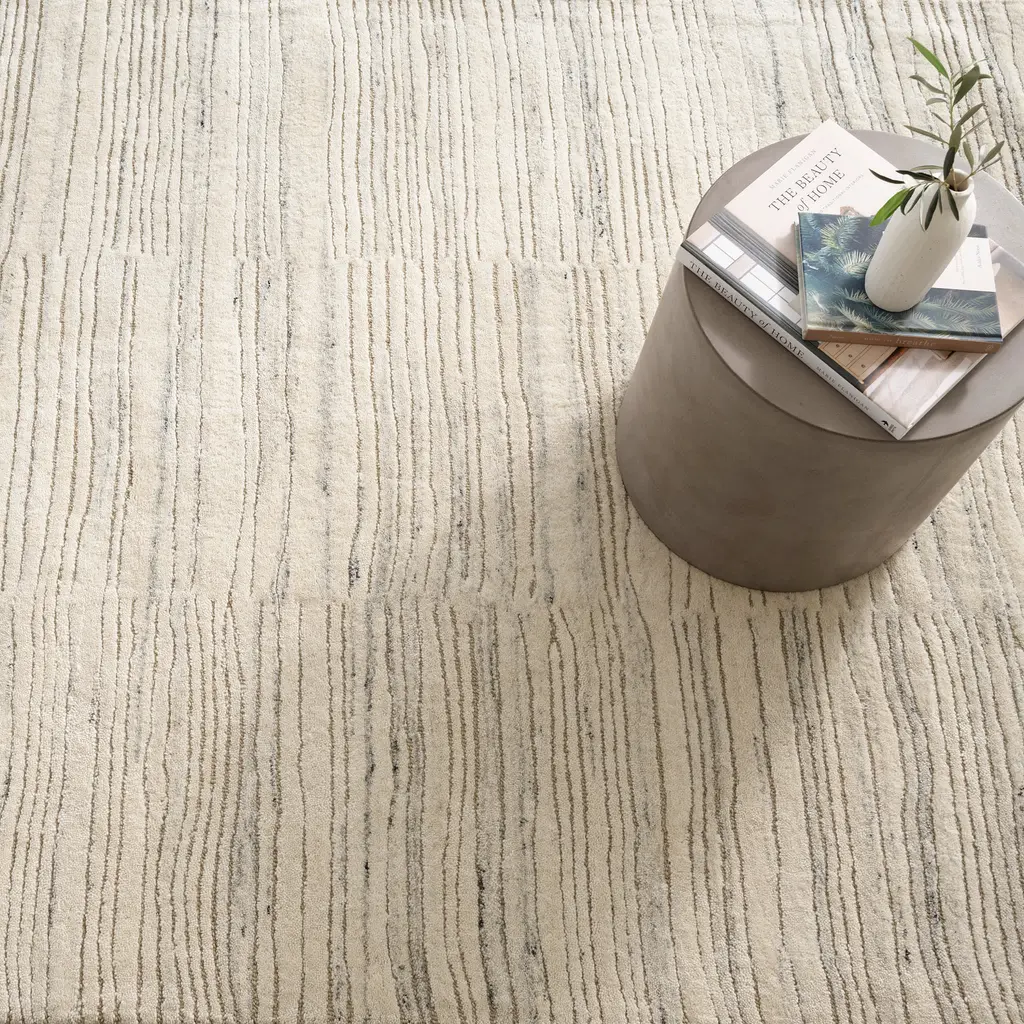 Inspired by substrate layers of sandstone sediments that chronicle the millennia, this luxurious, irregularly striped wool rug will stand the test of time. The subtle degradations of a natural undyed fleece pile enhance the finely observed irregular striping in a softly mineral palette. The subtle beauty of the higher sheared tufts emphasizes the contrast of the densely looped stripes. A signature motif of Marie Flanigan, an award-winning interior designer. This rug is a part of our design collaboration with Marie to produce a lifestyle collection that reflects her signature style of timeless elegance and innovative simplicity.