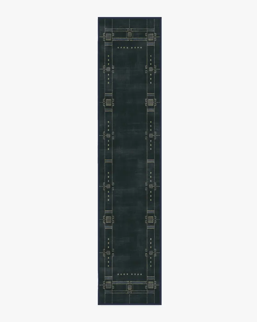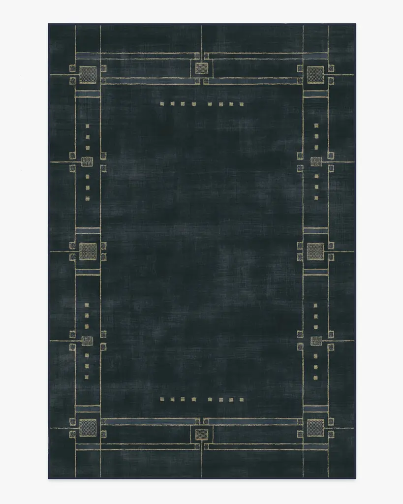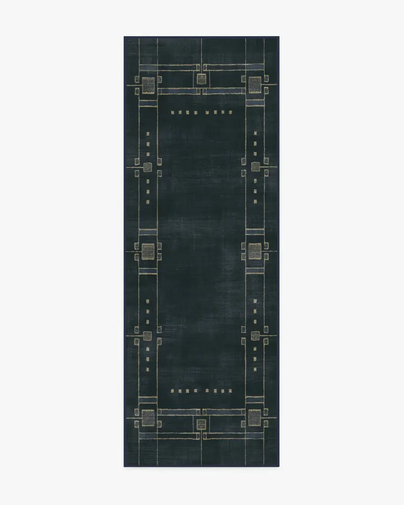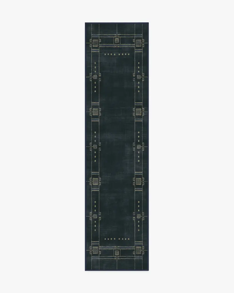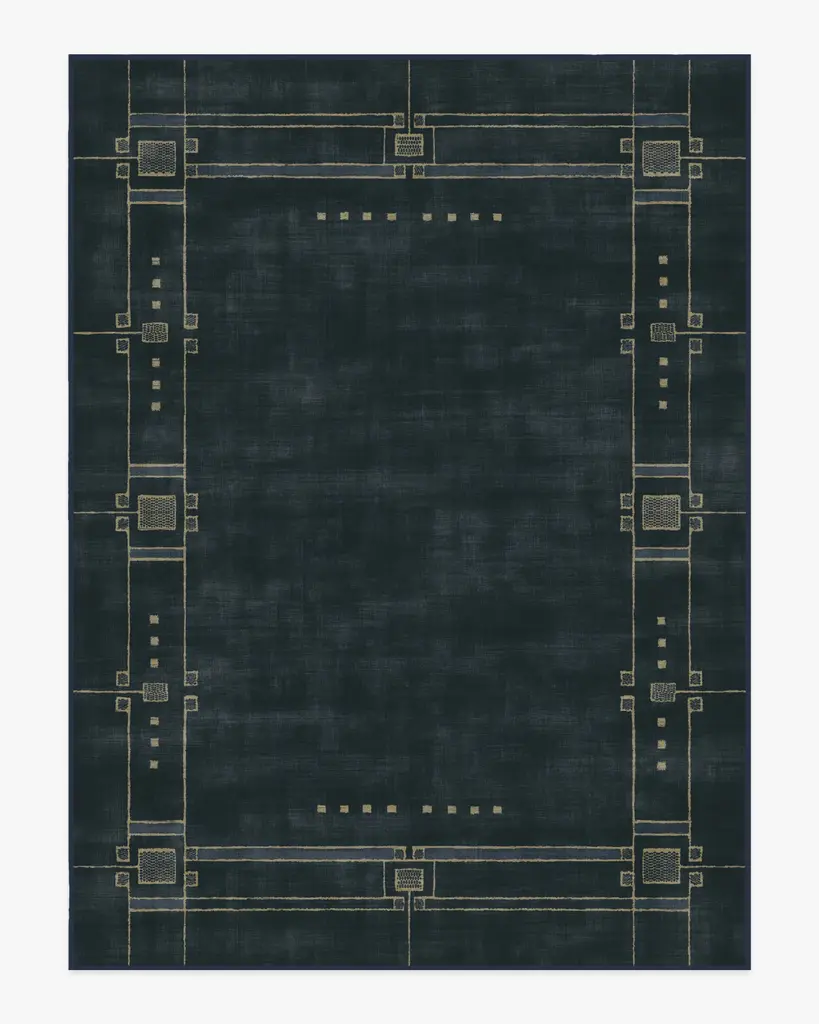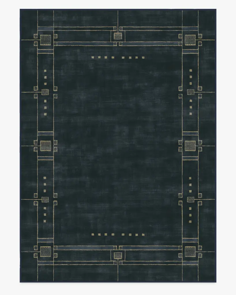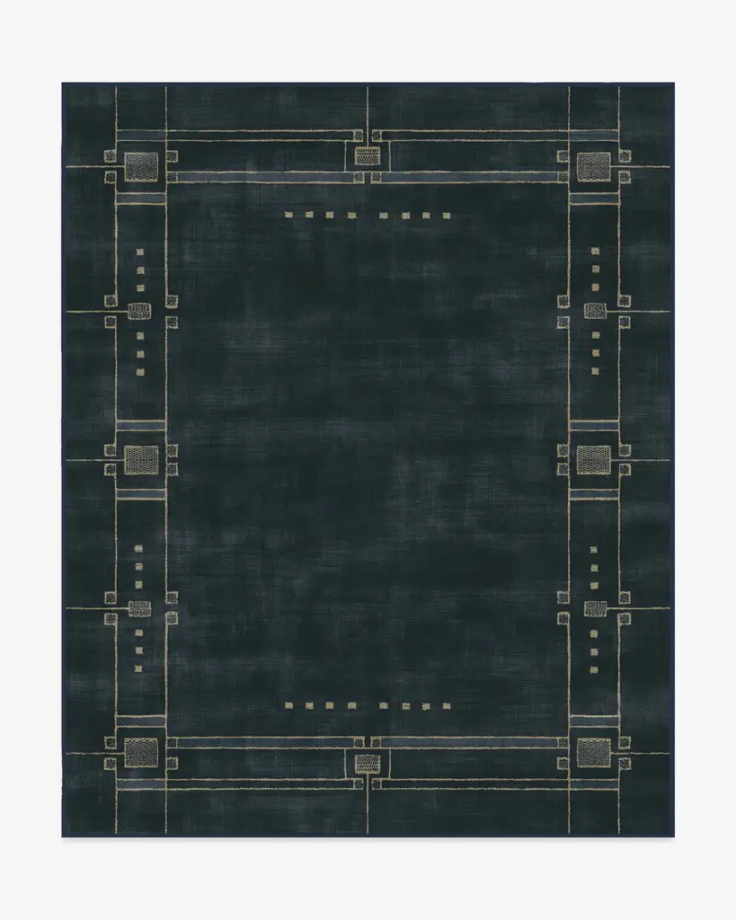 Discover 2025���s interior trends with our Architectural Digest Avery Midnight Blue Rug. This art deco-inspired design features a symmetrical border with intricate Art Deco detailing, beautifully balanced with a minimalist touch. The light cream linework subtly contrasts against a deep navy blue background, giving any space an updated 1920s aesthetic. Water-resistant, stain-resistant, and machine-washable. Rug colors may vary slightly according to your device and the lighting in your space.