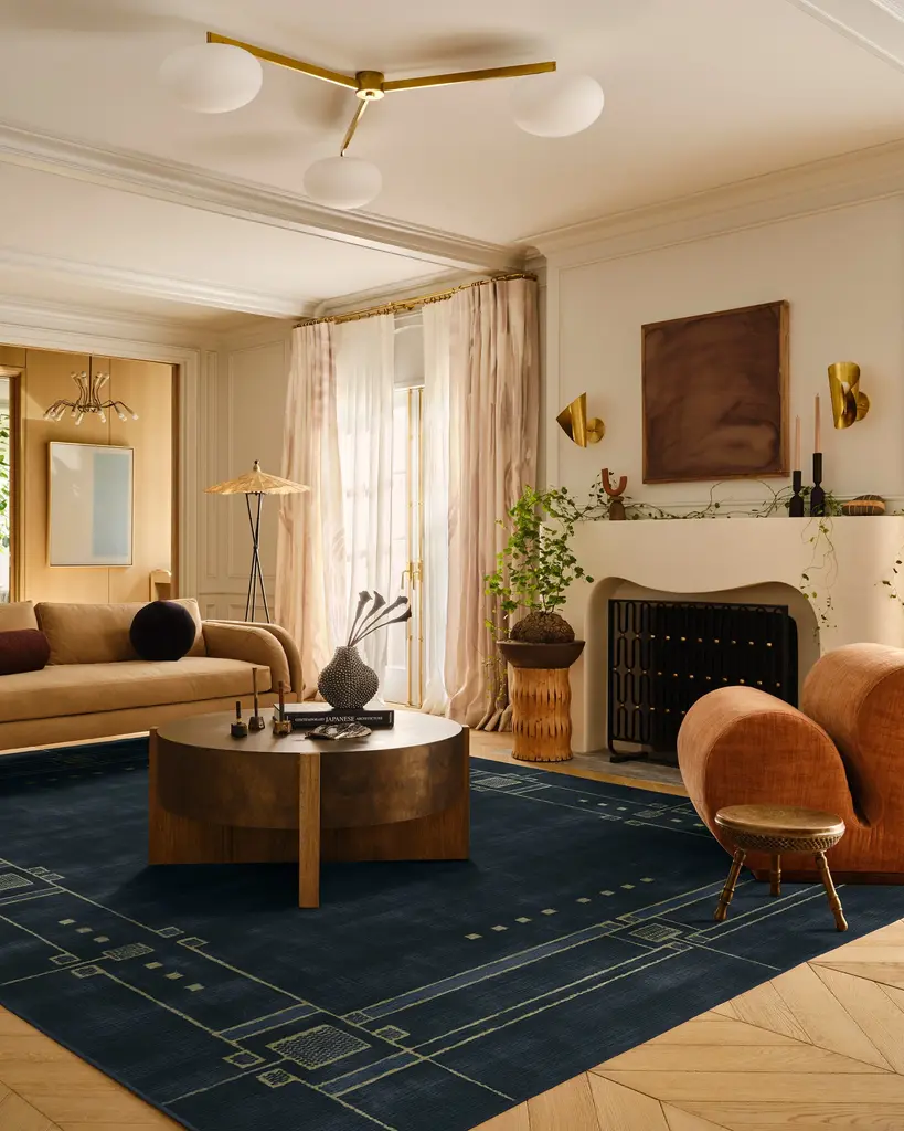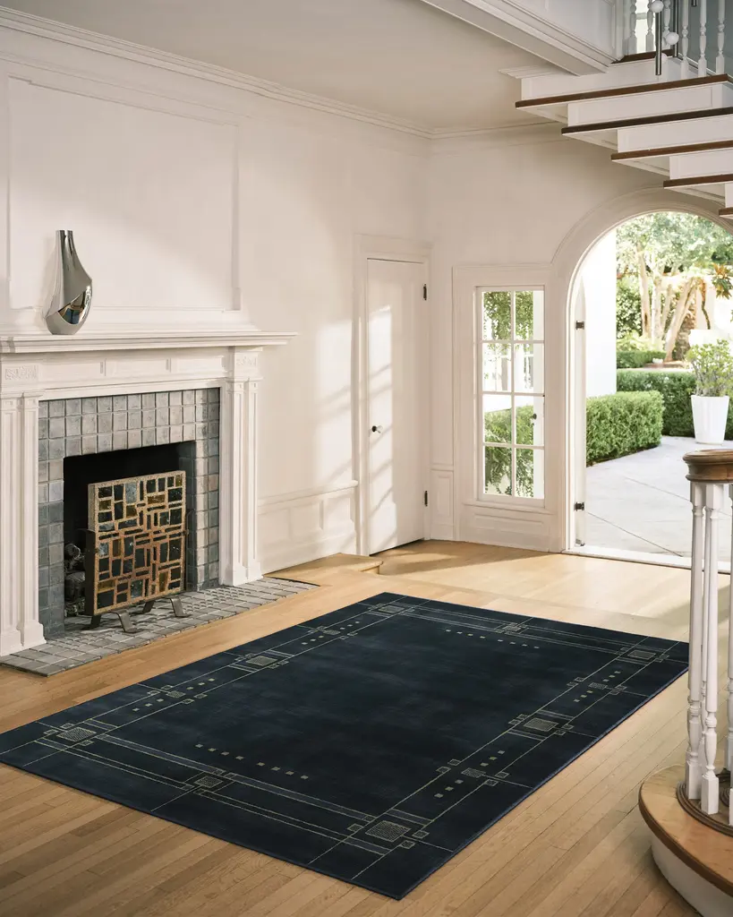 Discover 2025���s interior trends with our Architectural Digest Avery Midnight Blue Rug. This art deco-inspired design features a symmetrical border with intricate Art Deco detailing, beautifully balanced with a minimalist touch. The light cream linework subtly contrasts against a deep navy blue background, giving any space an updated 1920s aesthetic. Water-resistant, stain-resistant, and machine-washable. Rug colors may vary slightly according to your device and the lighting in your space.