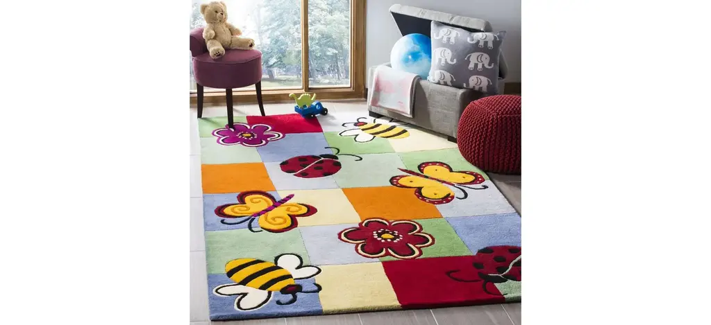 The Avicia Kid's Rug features a colorful design with a variation of insects and flowers for a fun addition to your kid's room. These rugs are made with pure soft wool and hand-tufted to a cotton backing for added cushion.