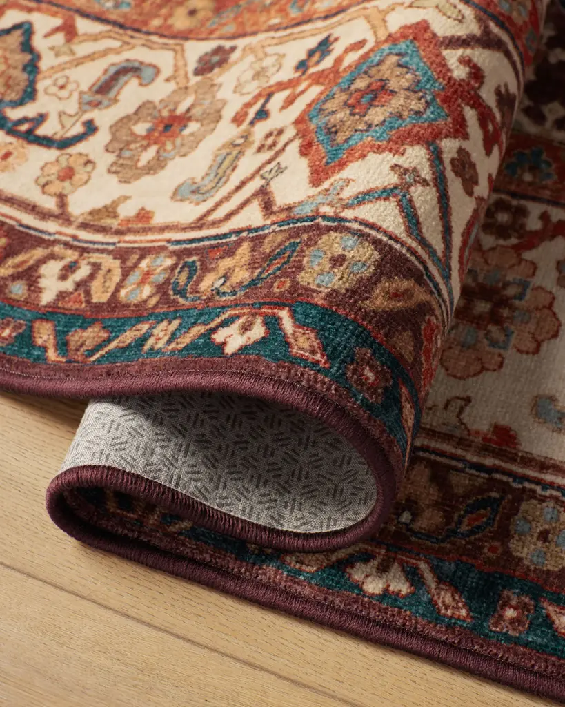 A statement piece that is as timeless as it is bold. The Avila Crimson & Currant Rug features large folk geometry and imperfect symmetry inspired by traditional Persian motifs. This rug is richly decorated with a palette of reds, complemented by shades of turquoise and aqua peppered throughout. Water-resistant, stain-resistant, and machine-washable. Colors may vary by device and lighting.