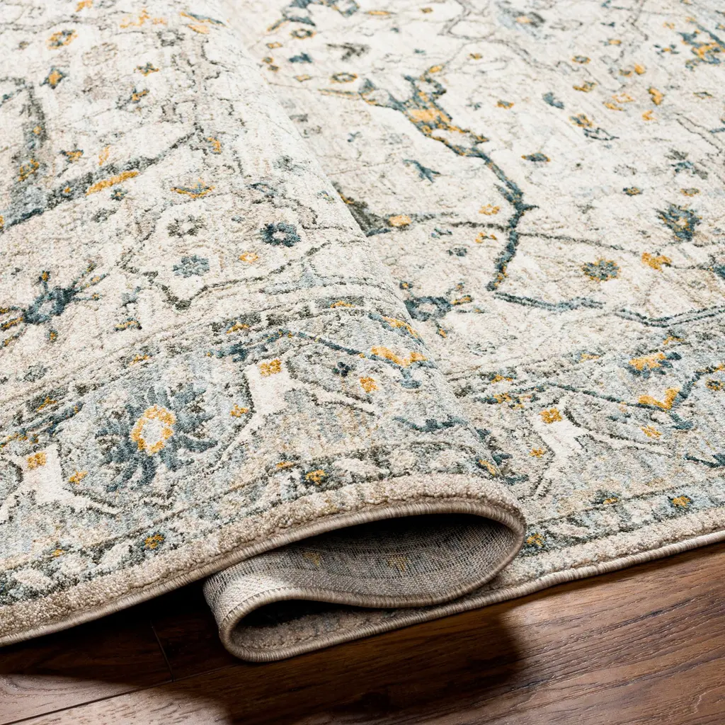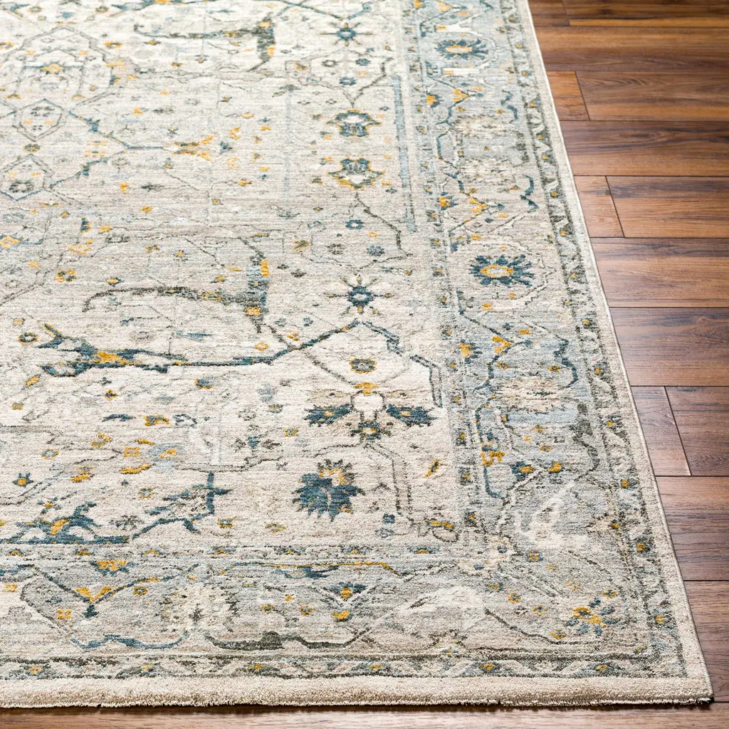 Collection: Aviva Colors: Taupe, Off White, Medium Gray, Teal, Olive, Light Gray, Mustard Construction: Machine Woven Material: 100% Polyester Pile: Medium Pile Pile Height: 0.35" Styles: Traditional Made In: Turkey Thickness: 0.43" Fringe Length: 0.43" Price Range: $$$$$ (Affordable)