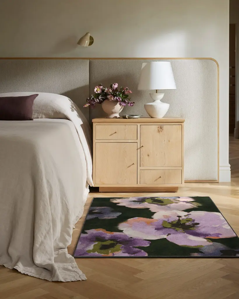 Bring the beauty of flowers indoors with our Avril Lavender Rug. Inspired by floral watercolor paintings, this delicate design blends muted pinks, lavender, peach, periwinkle, and olive greens, all layered on a rich, dark green background. Water-resistant, stain-resistant, and machine-washable. Rug colors may vary slightly according to your device and the lighting in your space.