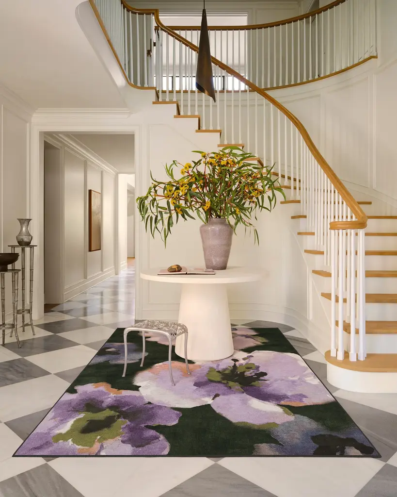 Bring the beauty of flowers indoors with our Avril Lavender Rug. Inspired by floral watercolor paintings, this delicate design blends muted pinks, lavender, peach, periwinkle, and olive greens, all layered on a rich, dark green background. Water-resistant, stain-resistant, and machine-washable. Rug colors may vary slightly according to your device and the lighting in your space.