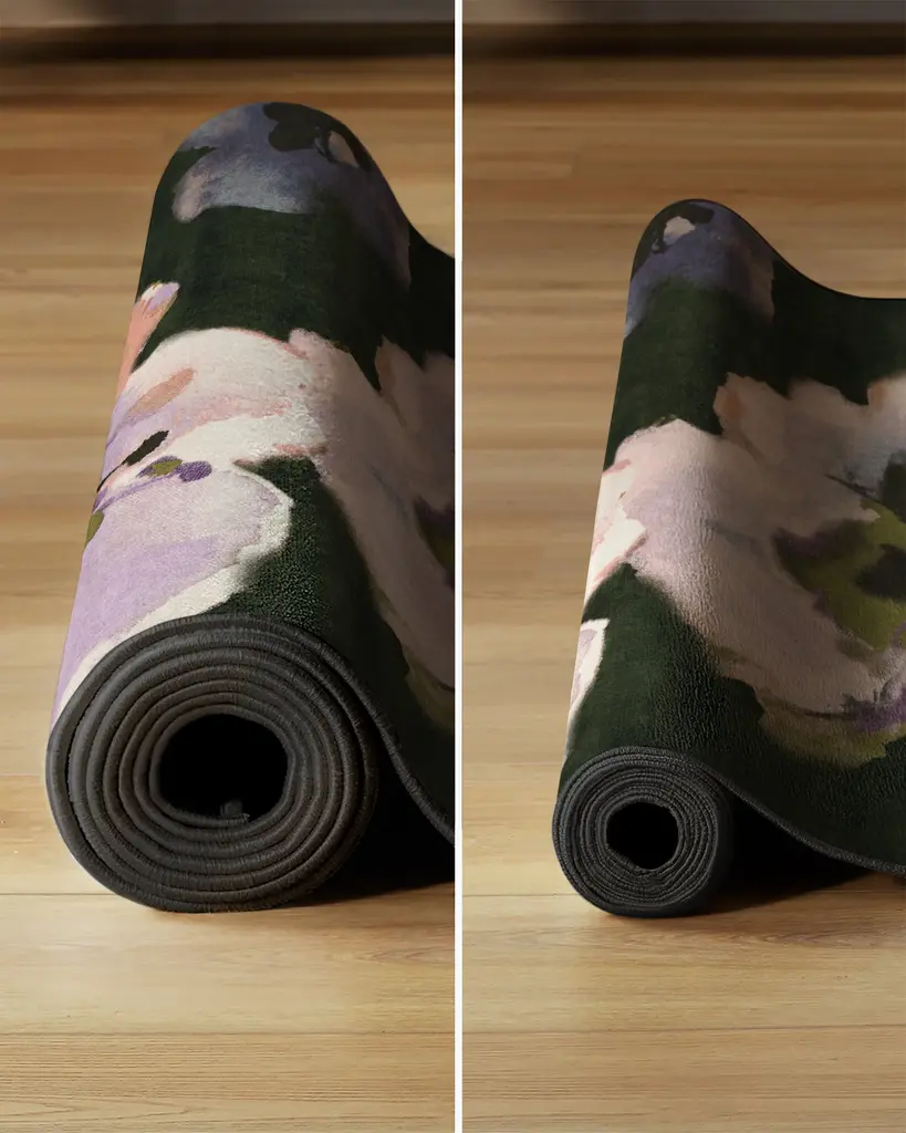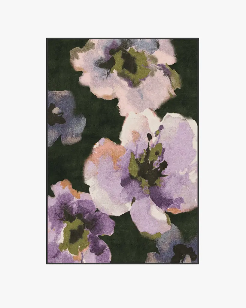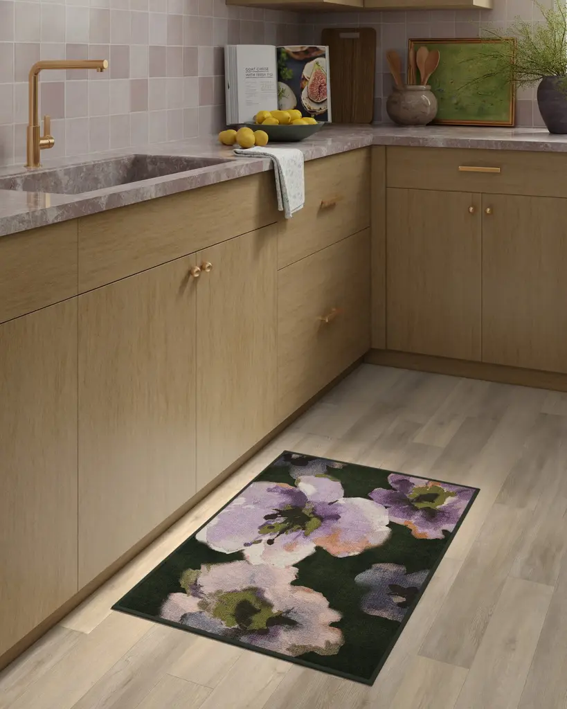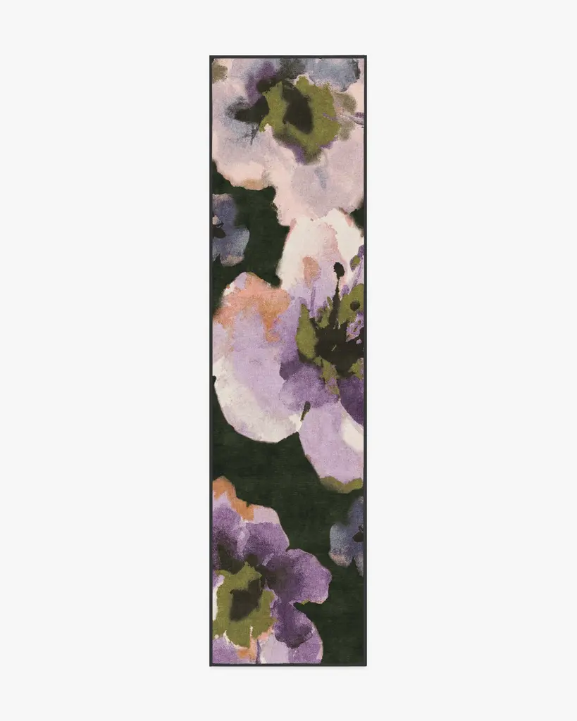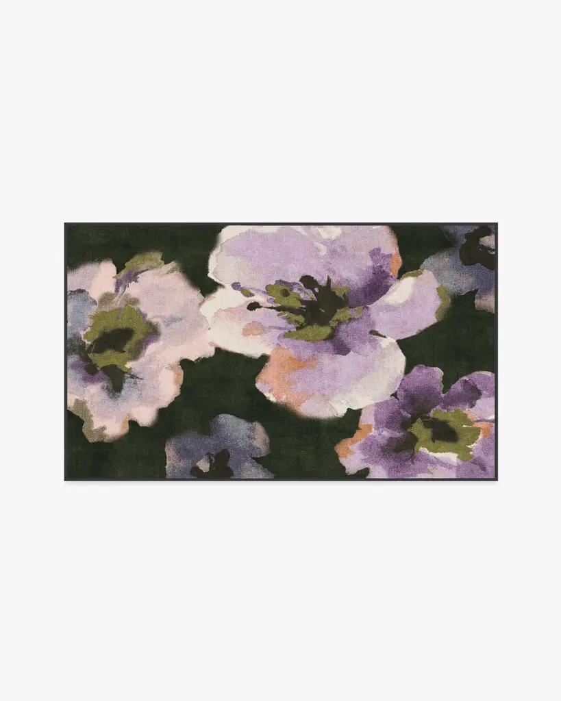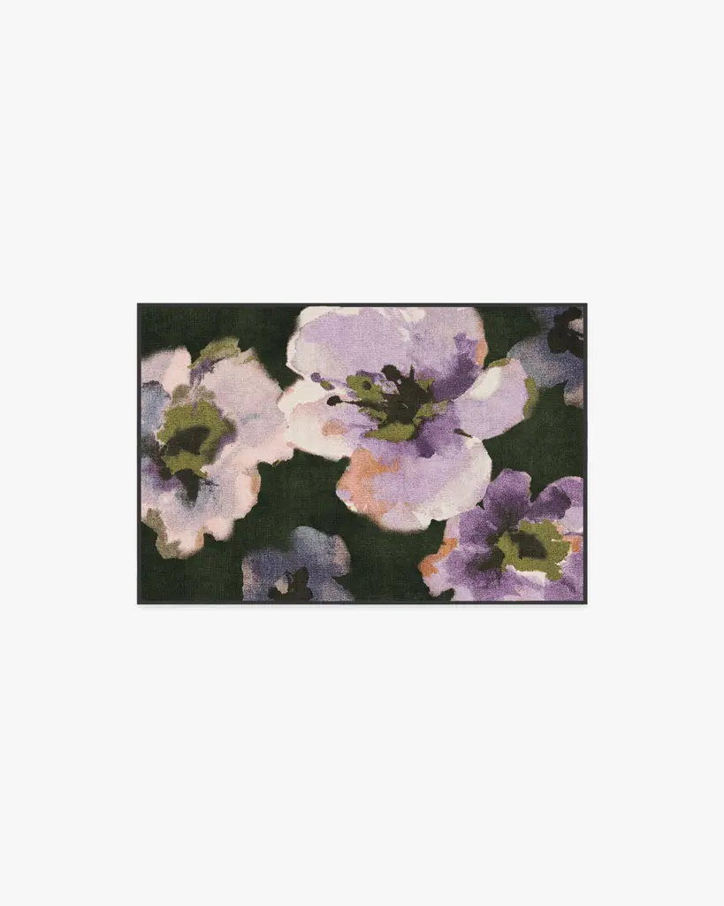 Bring the beauty of flowers indoors with our Avril Lavender Rug. Inspired by floral watercolor paintings, this delicate design blends muted pinks, lavender, peach, periwinkle, and olive greens, all layered on a rich, dark green background. Water-resistant, stain-resistant, and machine-washable. Rug colors may vary slightly according to your device and the lighting in your space.