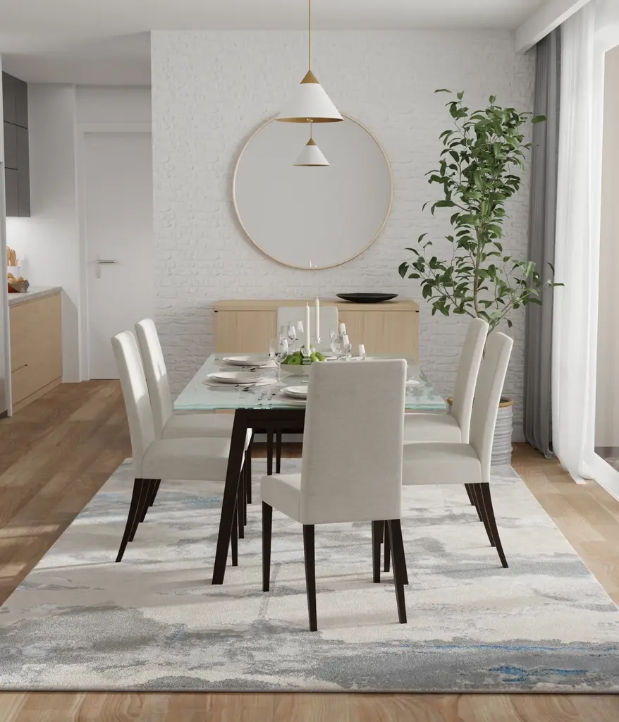 Collection: Azure Colors: Ivory, Gray, Blue Construction: Machine Made Material: Face: Polyester, Polypropylene / Warp: Cotton Pile: Low Pile Pile Height: 0.39" Styles: Contemporary,Casual,Industrial Backing: Cotton Made In: Turkey Thickness: 0.39" Price Range: $$$$$ (Affordable)
