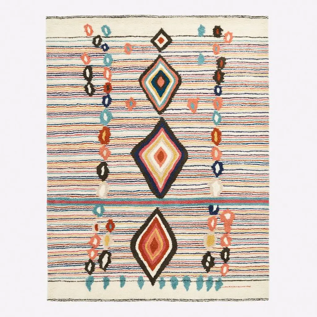 100% wool. Hand tufted. Shedding of loose fibers is normal with new wool rugs and a natural result of being handcrafted. Shedding will diminish with regular vacuuming, typically within three to six months. Rug Pad recommended (sold separately). Made in a Fair Trade Certified™ facility in India.