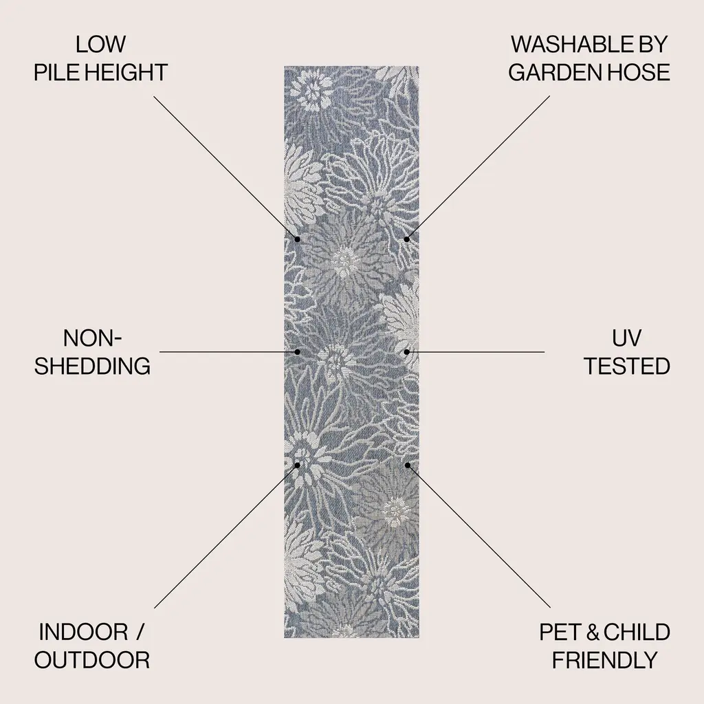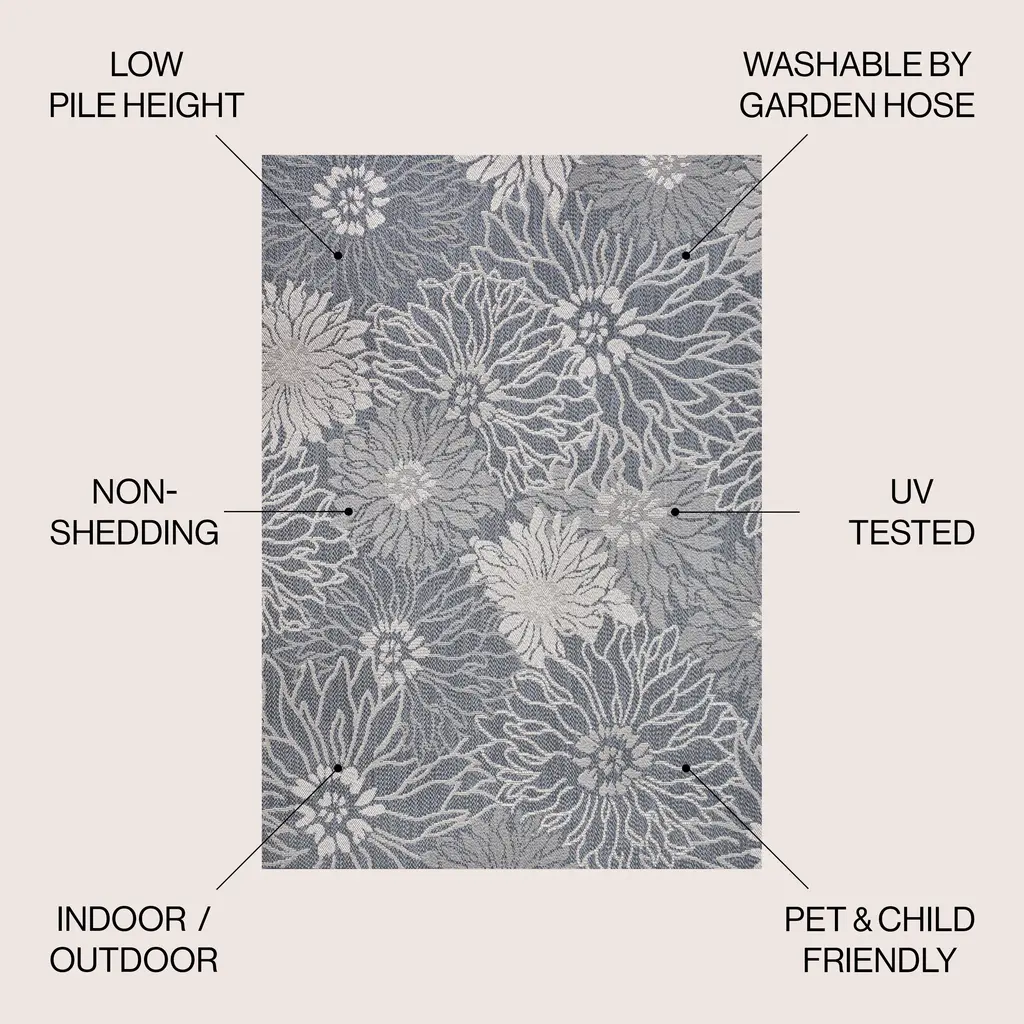 Layer on the cottage style with this lively rug's all-over floral design. The bold, graphic pattern mixes updated shades for a modern, artsy vibe. Easy-care low pile and a busy design make this pet-friendly rug perfect for a bedroom, living room, kitchen, dining area or porch.