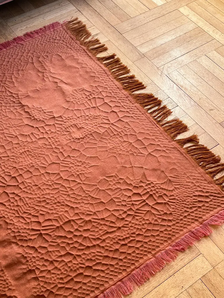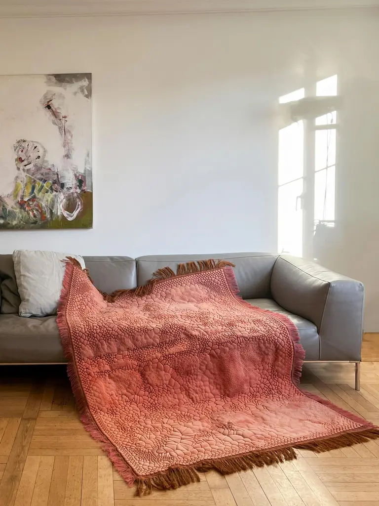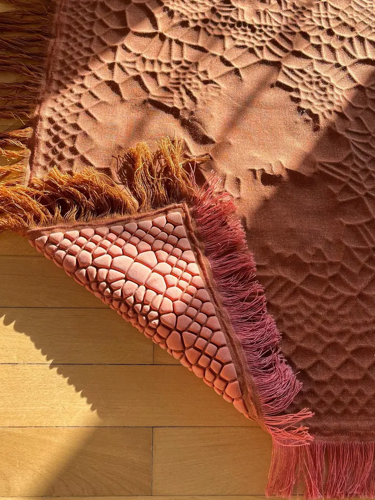 Baked ornament rug by Anima OnaDimensions: L 130 x H 190 cmMaterials: wool, Grdxkn foamThe Baked Ornament Rug is an abstraction of a traditional hand-wovencarpet and is inspired by oriental patterns. Its three-dimensonal pattern andthe surreal materiality playes with the perception of the viewer and inspiresdreamlike associations while walking over the bubbly pattern.Instead of weaving, the digitally produced pattern is printed directly on tothe fabric with the new textil technology GRDXKN. The printed textil colorexpands through heat and is reproducing the printed pattern like a relief onthe other side of the fabric. It is stabalizing the textile, is giving it a body,a shape and thus prevents it from slipping on the floor. The rug is reversible.anima ona is a design studio established in 2018 by Freia Achenbach (based in Stuttgart, Germany), Carlo Kurth (based in Hirschberg, Germany) and June Fàbregas (based in Barcelona, Spain).Their work focuses on objects, installations and spaces that are mentally stimulating, inspire phantasies and enhance the perception towards materiality and shapes. With their playful and symbolic approach they strive for a higher consciousness in everyday situations and want to make their fascination with nature accessible to others.The trio met at State Academy of Art and Design Stuttgart where they graduated with an industrial design diploma degree. Since 2018 they collaborate in commissioned as well as self-initiated projects.Their different located workplaces play an important and nourishing part of their collaboration, allowing them to implement a wider vocabulary when working together.In 2019 they were chosen as Finalist of Design Parade Hyères at Villa Noailles. Anima Ona´s projects have been exhibited around the world such as Milan, Paris, and Taipei.