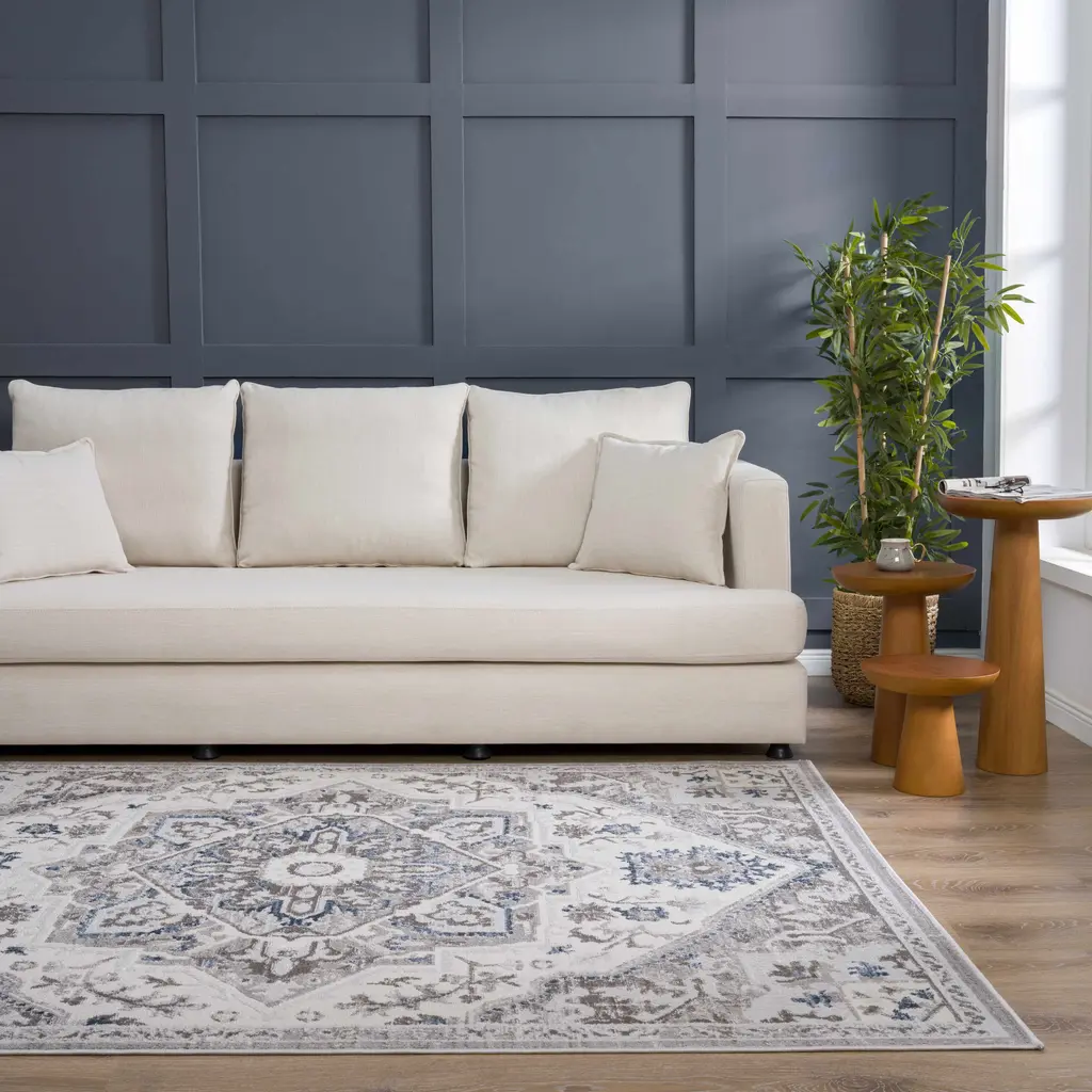 Brand: Hauteloom Collection: Bakir Colors: Gray, Blue Construction: Machine Woven Material: 60% Polypropylene / 40% Polyester Pile: High Pile Pile Height: 0.3" Backing: Jute Made In: Turkey Thickness: 0.3" Price Range: $$$$$ (Most Affordable)