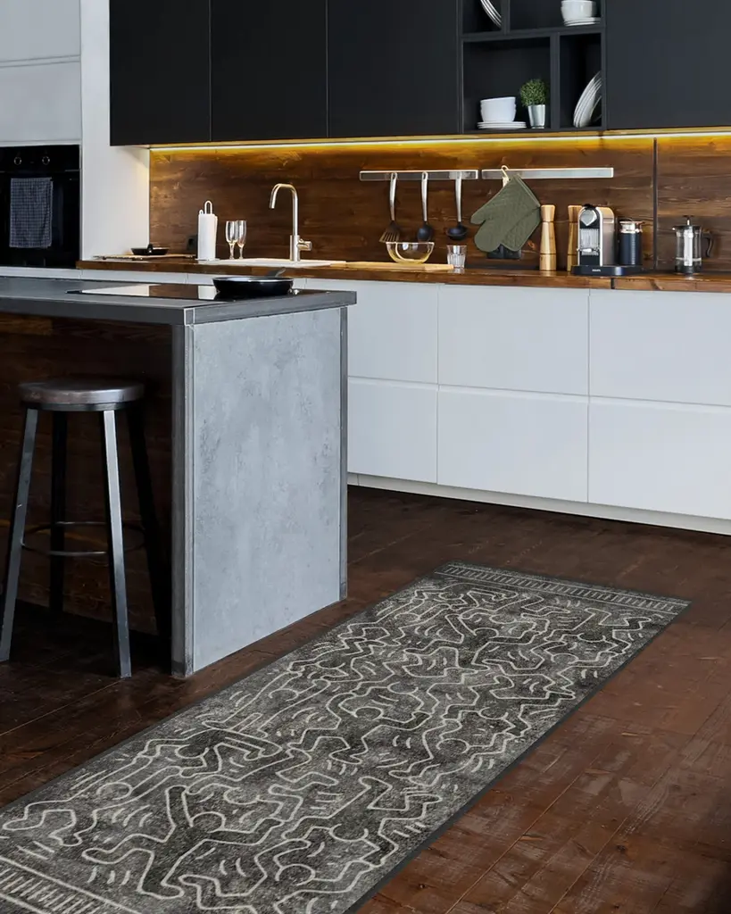 A classic trellis gets the Keith Haring treatment. Our Keith Haring Balancing Act Black Rug features Haring's figures stacked on top of each other to form this fun, repeating pattern. The soft black background with lighter accents of grey and white give this high-contrast design a textured look. Water-resistant, stain-resistant, and machine-washable.