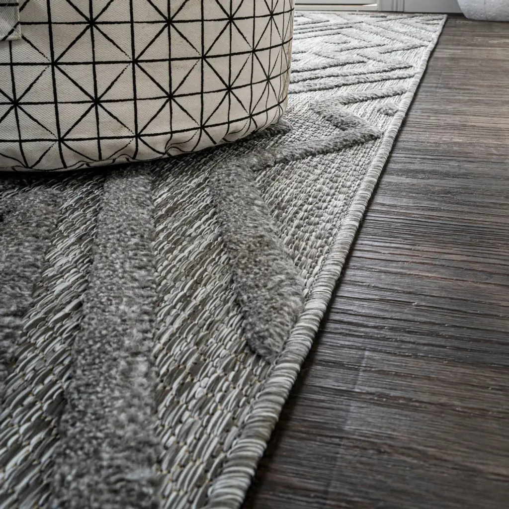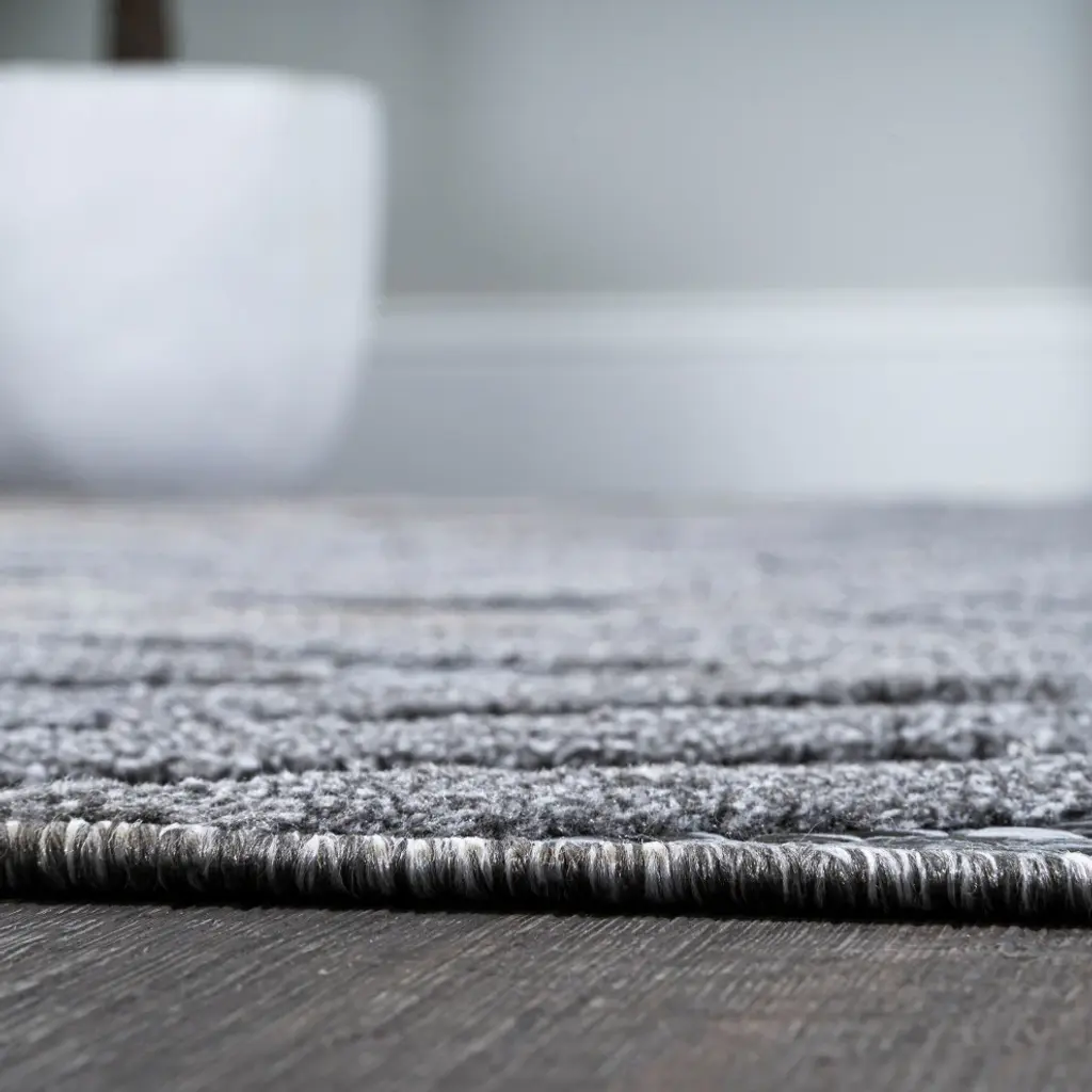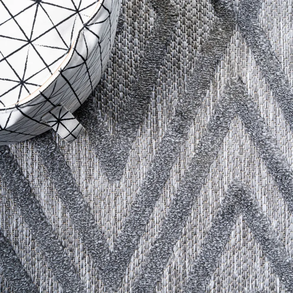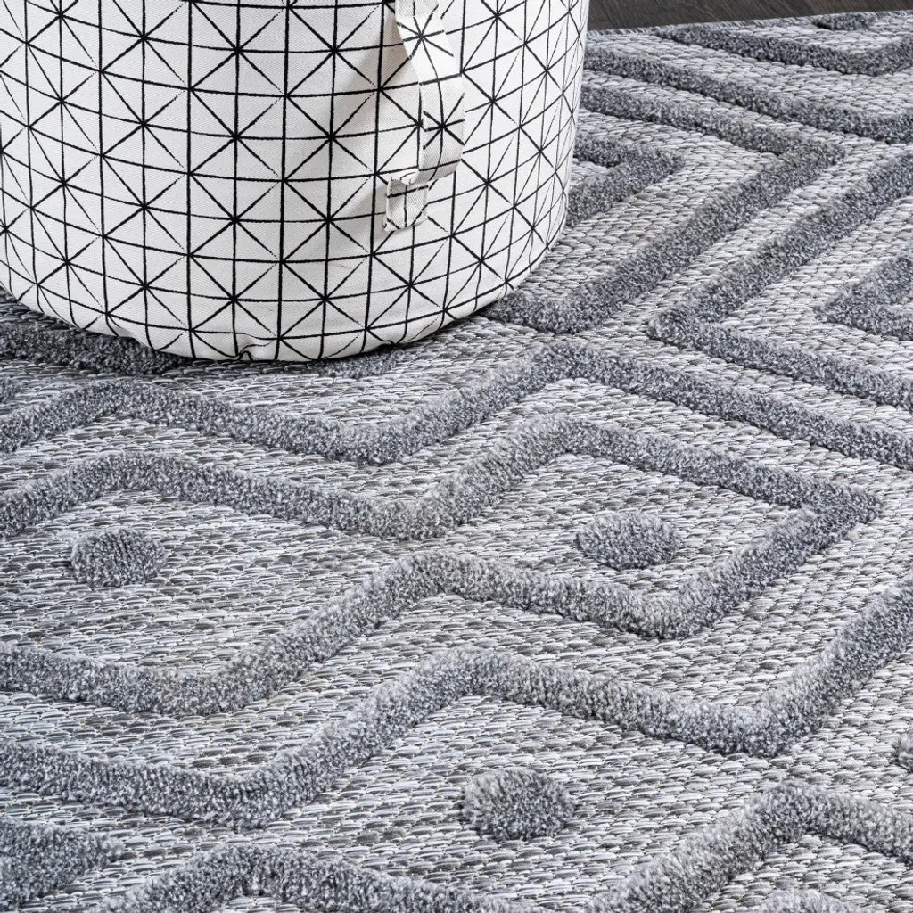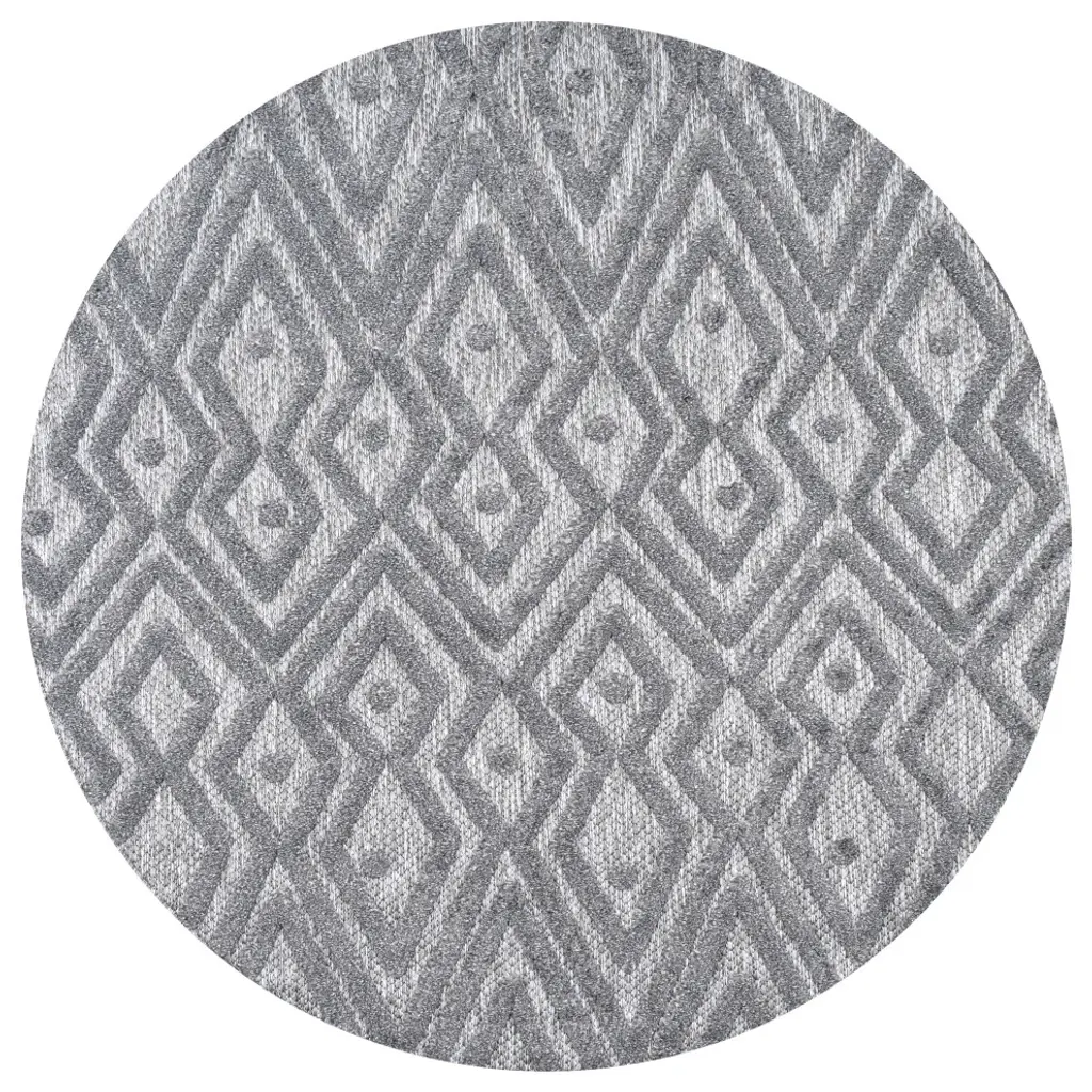 Inspired by vintage Moroccan rugs, our indoor/outdoor rug adds modern tribal style to your porch, patio or sunroom. The classic Moroccan pattern has a geometric design of gray diamonds, dots and zigzags. Mingled threads give this rug a handwoven, vintage vibe that''s perfect for an entry, kitchen, hallway, living room or bedroom too. The pet-friendly and kid-proof flatweave design makes it easy to clean, and perfect for the beach house.Features:• Power loomed in a low pile that''s soft and durable, with a latex backing for added stability• Woven in shades of gray with mingled threads for a handmade effect• Made from easy-care polypropylene - just sweep, vacuum or hose down with mild soap and water• 100% Polypropylene• No backing, use of rug pad is recommended (sold separately)• Power Loomed in Turkey• Actual Dimension: 5 ft. 3 in. x 5 ft. 3 in. Round• Color: Dark Gray• Thickness measures: 0.43 in.• Available in multiple sizes and/or colorsRug Care:• Vacuum regularly and spot clean as needed; avoid direct and continuous exposure to sunlight; use brushless vacuum; remove spills immediately; if liquid, blot with clean, undyed cloth by pressing firmly around the spill to absorb as much as possible; for hard to remove stains, professional rug cleaning is recommended; store in a dry, well ventilated area and rotate for consistent wear• Packing and shipping may cause temporary creases in rugs, which will flatten out after a week on the floor; to expedite the process, try back-rolling your rug before laying it down, and then allow ample time for the remaining creases to relax• Please Note: Due to differences in monitors, some rug colors may vary slightly. Lengths and widths may vary from the published dimensions. Patterns may vary slightly according to shape and size selected.
