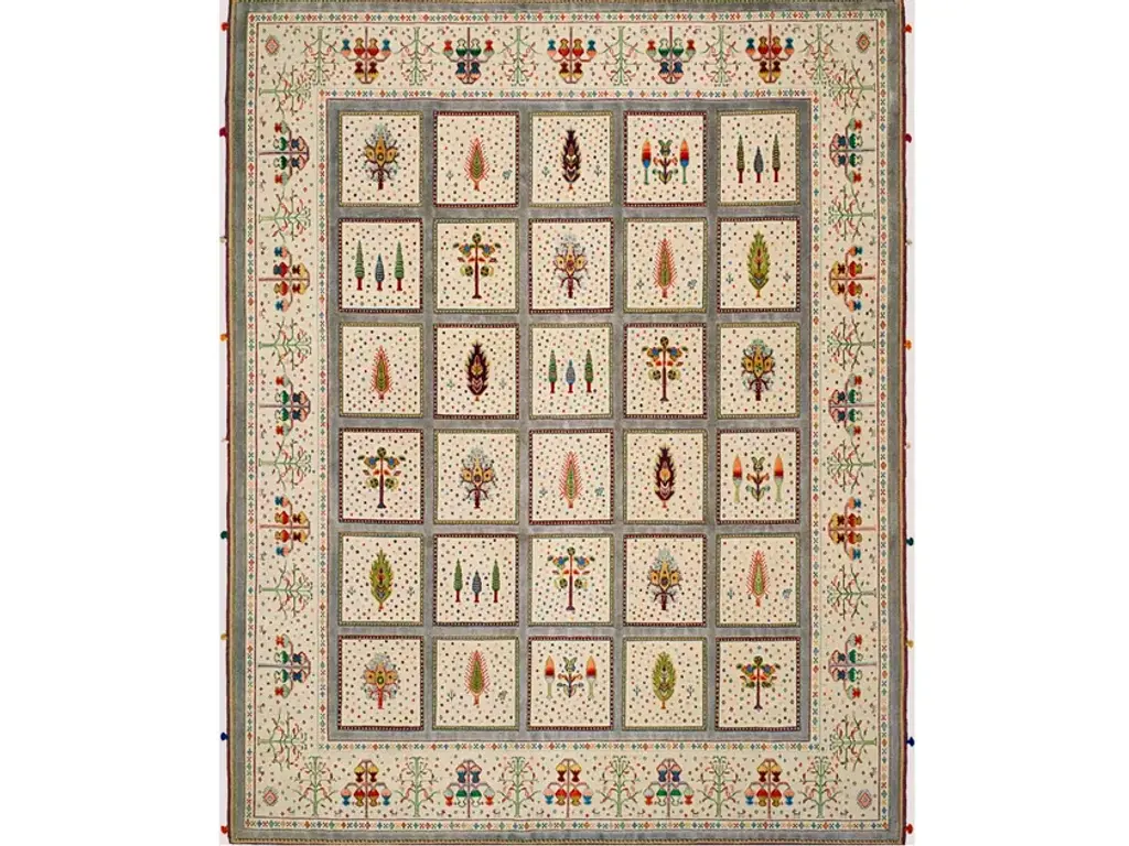 Baluch Soumak 4 is a rectangular wool rug.Zollanvari introduced ‘Baluch Soumaks’ to the market for the first time in collaboration with Baluch nomads. These weavings combine kilim, soumak and pile weaving techniques to create a multi-textured jewel-like surface that gives the rugs depth and a three- dimensional appearance. They are now being woven in the southeast,, home to Afshar nomads who were originally from Turkey. Woven in wool, we have added silk to highlight the design motifs. The colour palette we have recently developed uses lighter shades such as creams and pale greens to give these rugs a modern tribal look.Two new collections that represent a fusion of various tribal traditions – that of Berber carpets of the Beni Ourain people and Zigorat carpets of the Fars region – will be launched in 2017. The new Maghreb’i Zigorat carpets combine the style and quality of the weavings of the nomads with Berber designs from the Rif Mountains region of Morocco. The Zigorat Pelt Collection fuses the technique of Zigorat carpets with high pile and flatwoven (kilim) ends, the design motifs of traditional Gabbehs and the animal pelt effects of Berber rugs. Both collections are designed for contemporary interiors.
