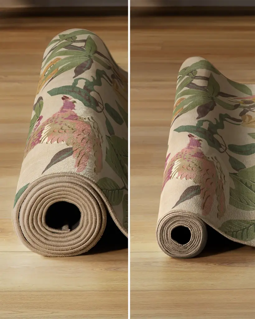 Bring home the tropics with our Sanderson Bamboo & Bird Blush & Jade Rug. Delicate bamboo, hibiscus, hydrangea, and wisteria motifs create a twisting framework for birds to perch. Its palette blends olive greens, teal blues, bright teal accents, browns, yellows, magentas, and pinks, with pops of bright cream against a light cream background. Water-resistant, stain-resistant, and machine-washable. Rug colors may vary slightly according to your device and the lighting in your space.