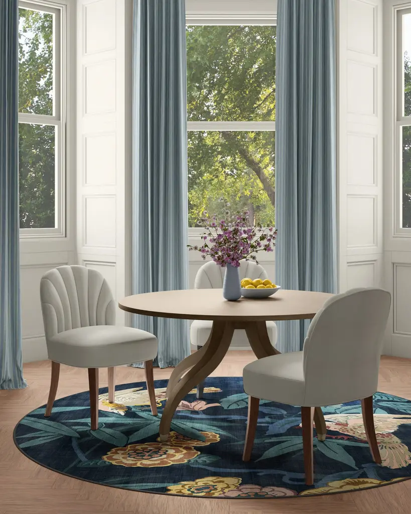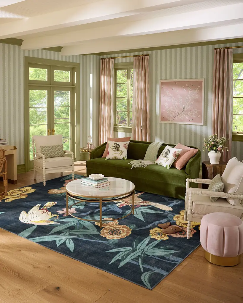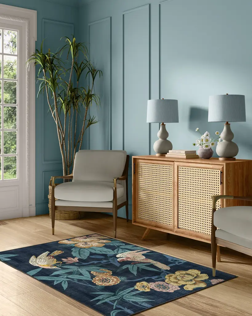 Bring home the tropics with our Sanderson Bamboo & Bird Indigo Rug. Delicate bamboo, hibiscus, hydrangea, and wisteria motifs create a twisting framework for birds to perch. Its palette blends turquoise and bright blues, yellows, ochres, oranges, pinks, corals, and beiges, with pops of light cream against a deep indigo blue background. Water-resistant, stain-resistant, and machine-washable. Rug colors may vary slightly according to your device and the lighting in your space.