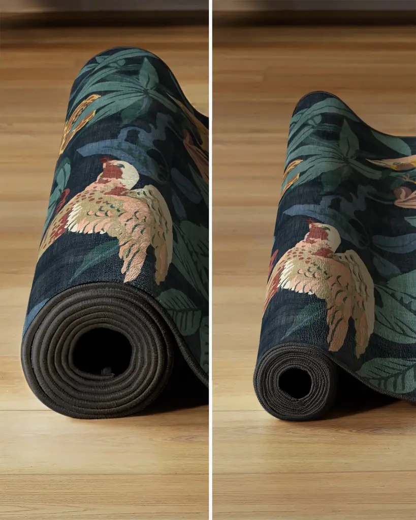 Bring home the tropics with our Sanderson Bamboo & Bird Indigo Rug. Delicate bamboo, hibiscus, hydrangea, and wisteria motifs create a twisting framework for birds to perch. Its palette blends turquoise and bright blues, yellows, ochres, oranges, pinks, corals, and beiges, with pops of light cream against a deep indigo blue background. Water-resistant, stain-resistant, and machine-washable. Rug colors may vary slightly according to your device and the lighting in your space.