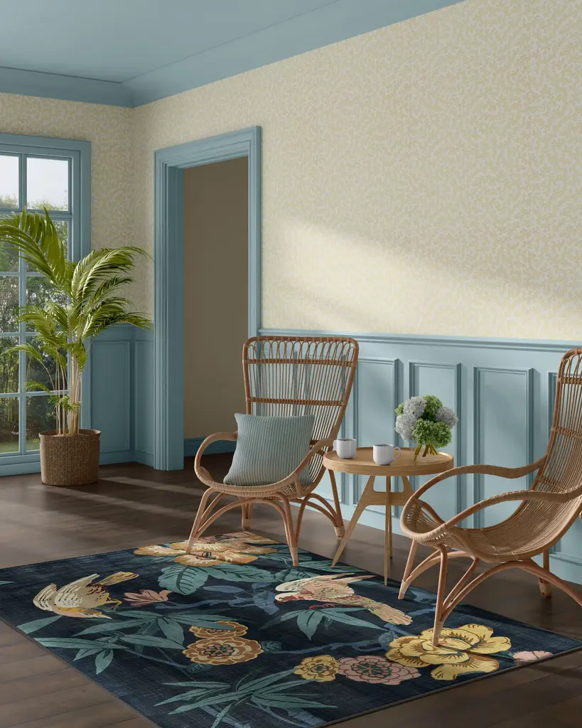 Bring home the tropics with our Sanderson Bamboo & Bird Indigo Rug. Delicate bamboo, hibiscus, hydrangea, and wisteria motifs create a twisting framework for birds to perch. Its palette blends turquoise and bright blues, yellows, ochres, oranges, pinks, corals, and beiges, with pops of light cream against a deep indigo blue background. Water-resistant, stain-resistant, and machine-washable. Rug colors may vary slightly according to your device and the lighting in your space.