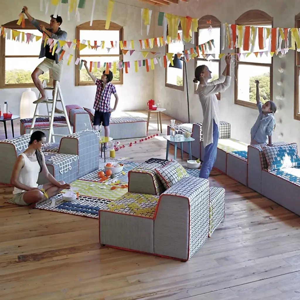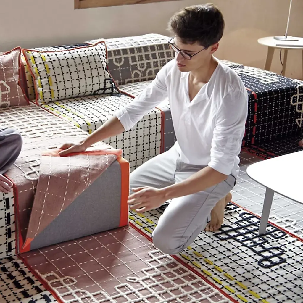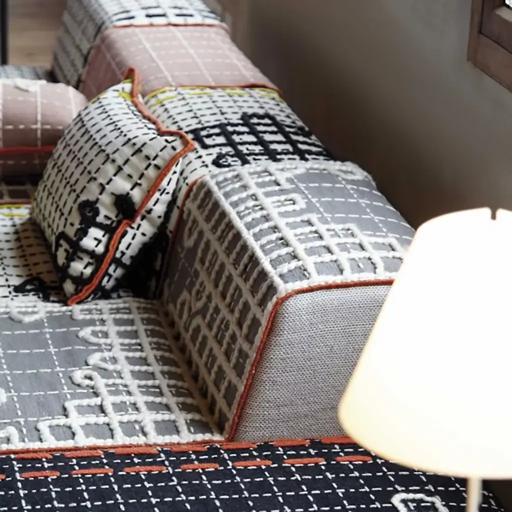 The playful pattern, texture and color palette of the Gan Rugs Bandas Chair D make it a welcome addition into any fun living space. Designed by Patricia Urquiola, this modular lounge can be mixed and matched with other Bandas seating and rugs. It is made out of 100% new wool that is variably hand loomed, embroidered and crocheted.