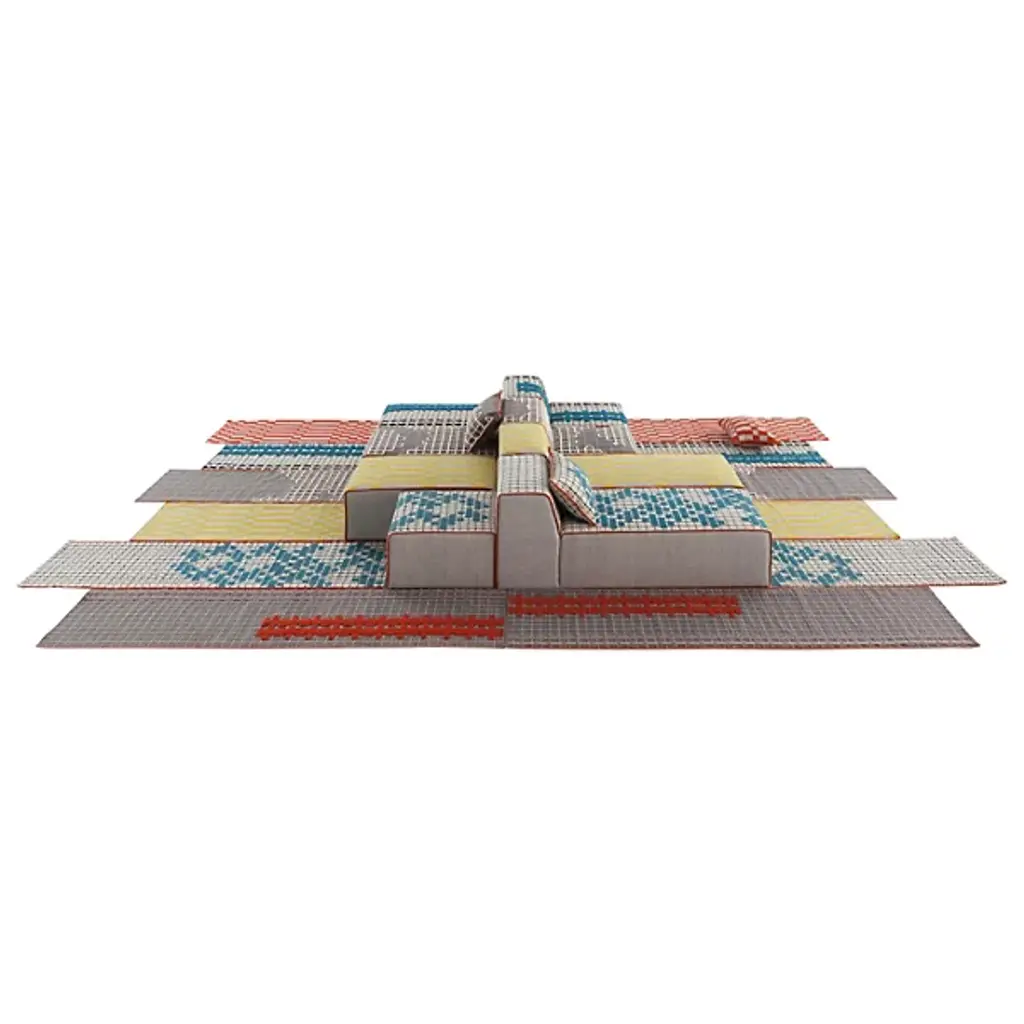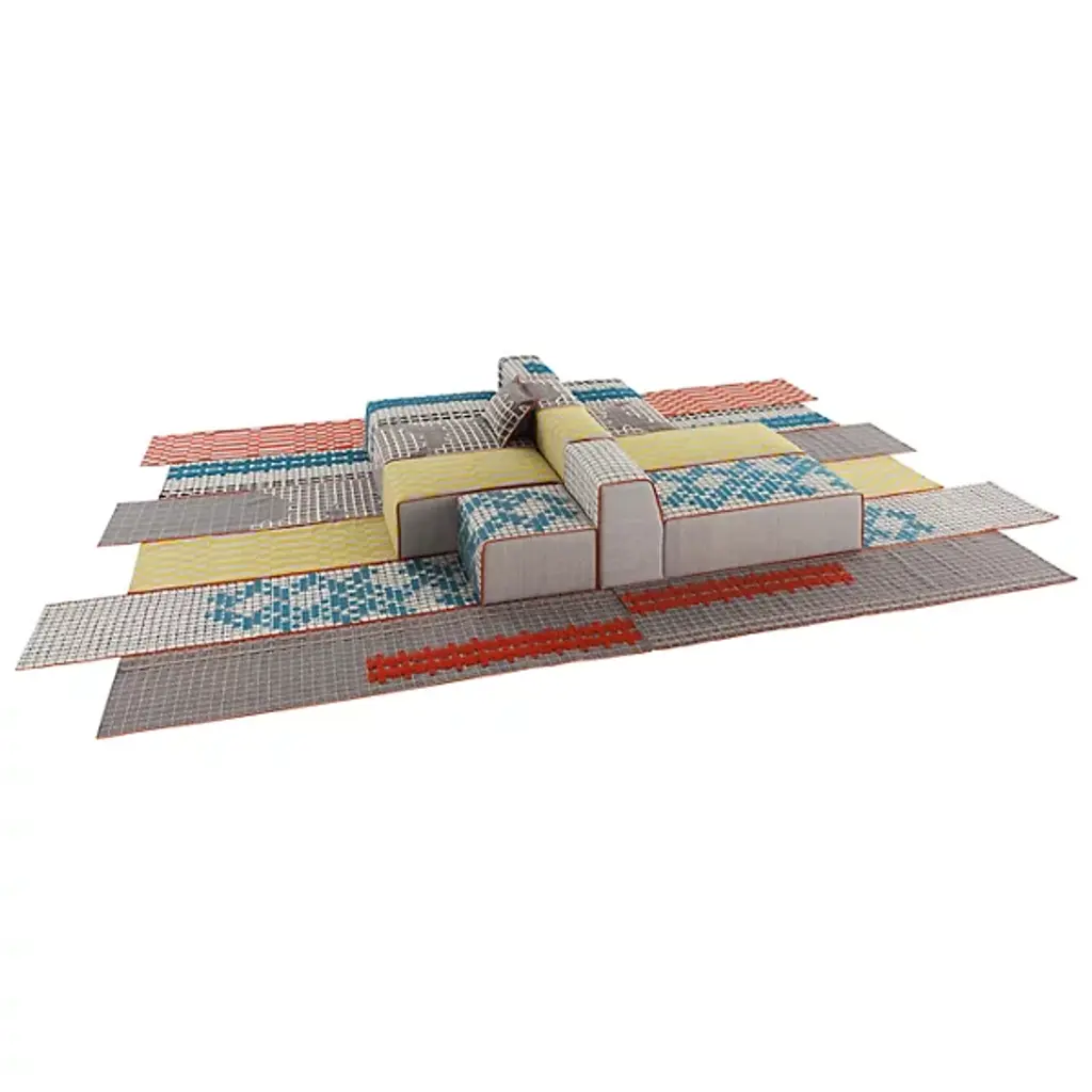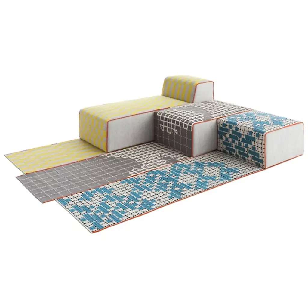 Pull your living space together and put your feet up. The Gan Rugs Bandas Small Pouf C complements the rest of the Bandas collection with its unique and colorful texture and pattern. It's made out of wool yarn that is hand loomed, embroidered and crocheted. Designed by Patricia Urquiola.