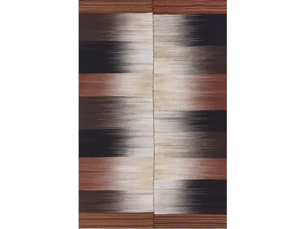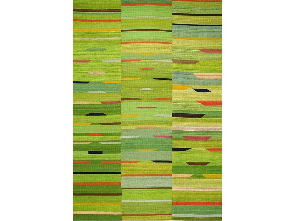 Baneh Kelim 1 is a rectangular wool rug.Zollanvari ‘minimalist’ kilims are diverse. Baneh kilims are woven in northern regions in sections using natural undyed wools and then skilfully stitched together. The one-piece Zagros kilims woven by the Luri and Ghashgha’i nomads are monochromatic. They have traditional ‘lazy lines’ that form subtle patterns of diamonds and squares. Maryam kilims, woven by the same tribes, have plain ground colours with repeat motifs hand-embroidered in pure silk, awarded Best Innovation at the CDAs in 2009. The jewel in the crown of our ‘minimalist’ flatweaves is a collection that draws inspiration from the old and antique Mazandaran kilims that have appeared on the market in the past decade – a truly modern collection. Caprino is a new flatweave collection woven from undyed goat’s hair on which pile-knotted erratic modernist lines in bright colours are superimposed.