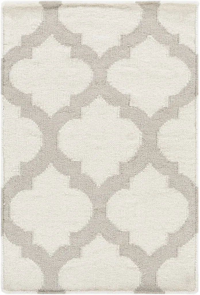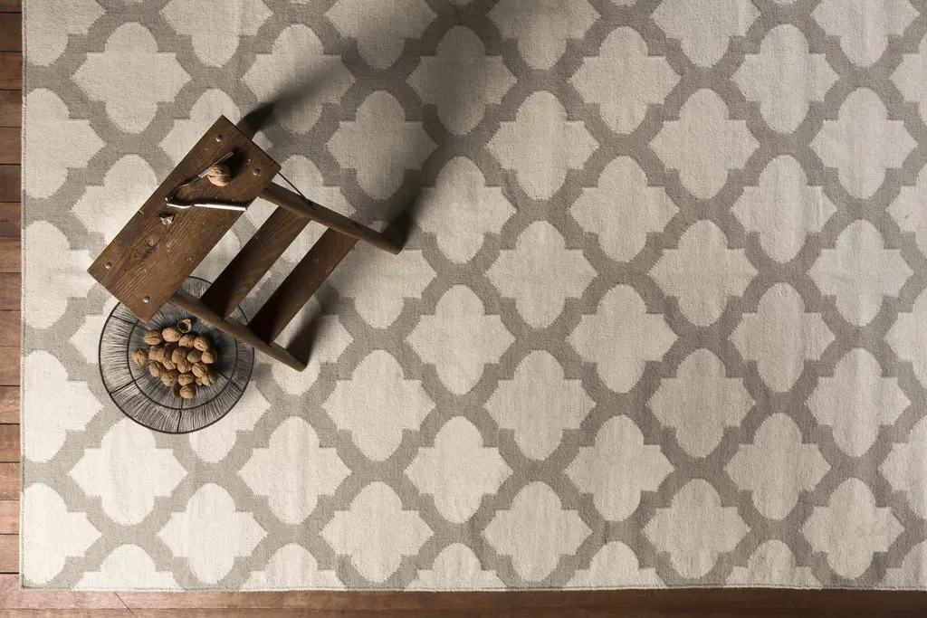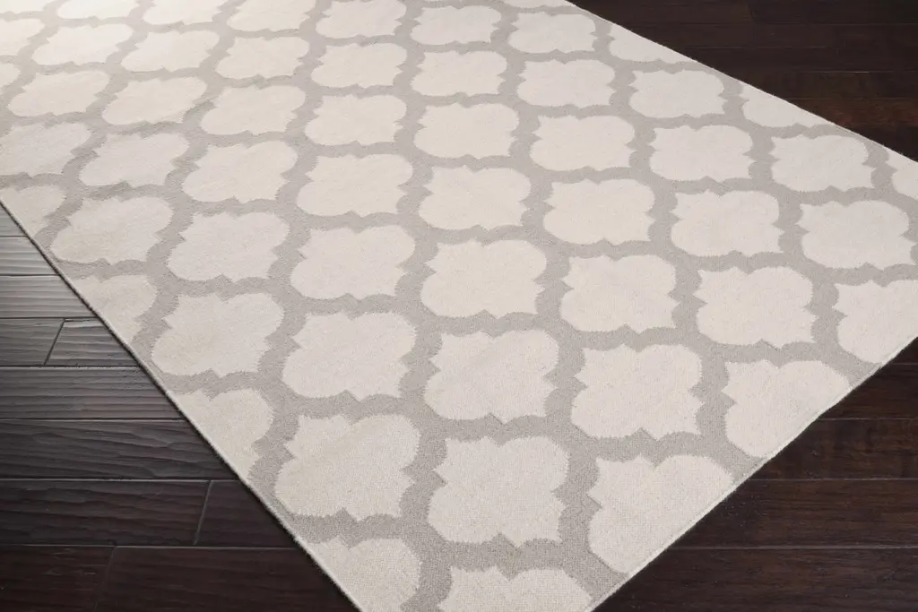 Collection: Banks Colors: Ivory, Medium Gray Construction: Hand Woven Material: 100% Wool Pile: No Pile Styles: Transitional Made In: India Thickness: 0.16" Price Range: $$$$$ (Most Affordable)