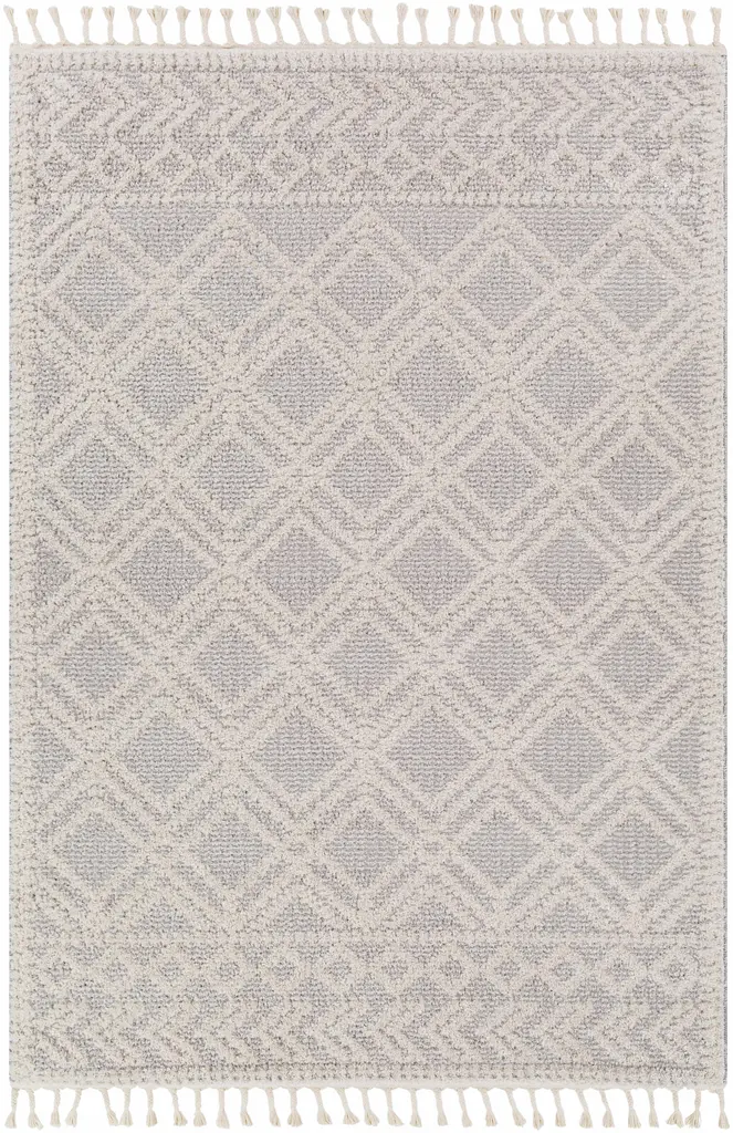 Collection: Bansalan Colors: Cream, Medium Gray Construction: Machine Woven Material: 70% Polyester, 30% Polypropylene Pile: High Pile Pile Height: 0.71" Styles: Transitional,Bohemian Made In: Turkey Thickness: 0.79" Fringe Length: 4.3" Price Range: $$$$$ (Most Affordable)