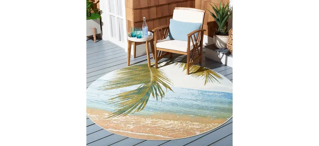 Lush, tropical sensations come to contemporary patio decor in Safavieh's Barbados Sand Indoor/Outdoor Area Rug Collection. Barbados' rugs turn entertainment spaces and outdoor leisure-living areas into at-home resorts with their vivid colors and scenic designs. Made using soft synthetic yarns for lasting charm and color season after season.