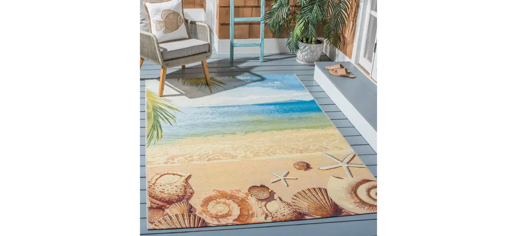 Lush, tropical sensations come to contemporary patio decor in Safavieh's Barbados Shell Indoor/Outdoor Area Rug Collection. Barbados' rugs turn entertainment spaces and outdoor leisure-living areas into at-home resorts with their vivid colors and scenic designs. Made using soft synthetic yarns for lasting charm and color season after season.