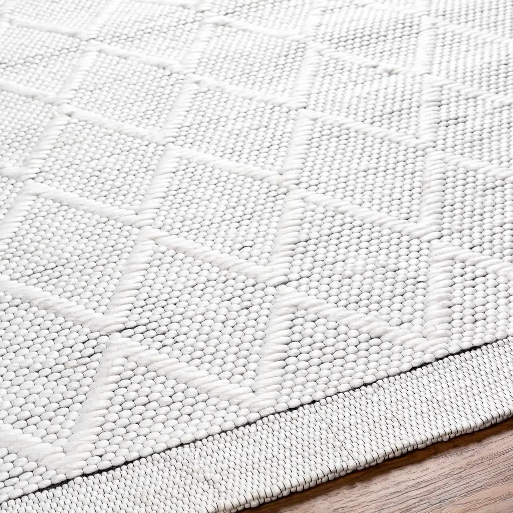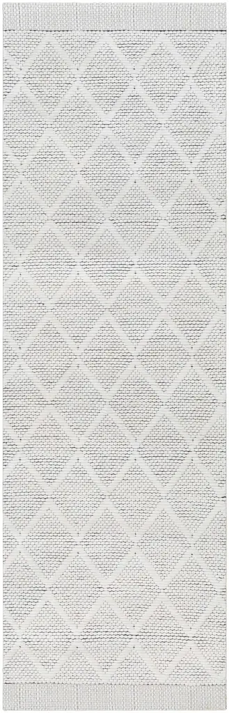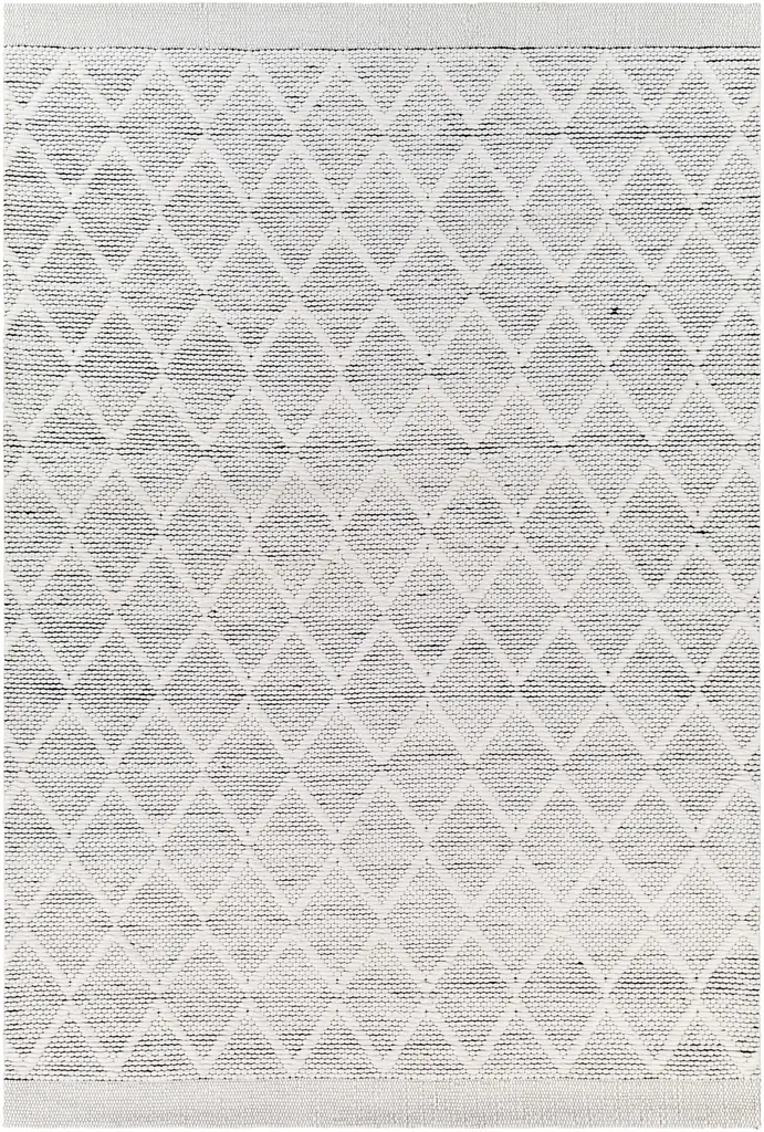 Collection: Bartimaeus Colors: Cream, Black Construction: Hand Woven Material: 30% Wool,70% RecycledPETYarn Pile: No Pile Styles: Transitional,Traditional Made In: India Thickness: 0.35" Price Range: $$$$$ (Affordable)