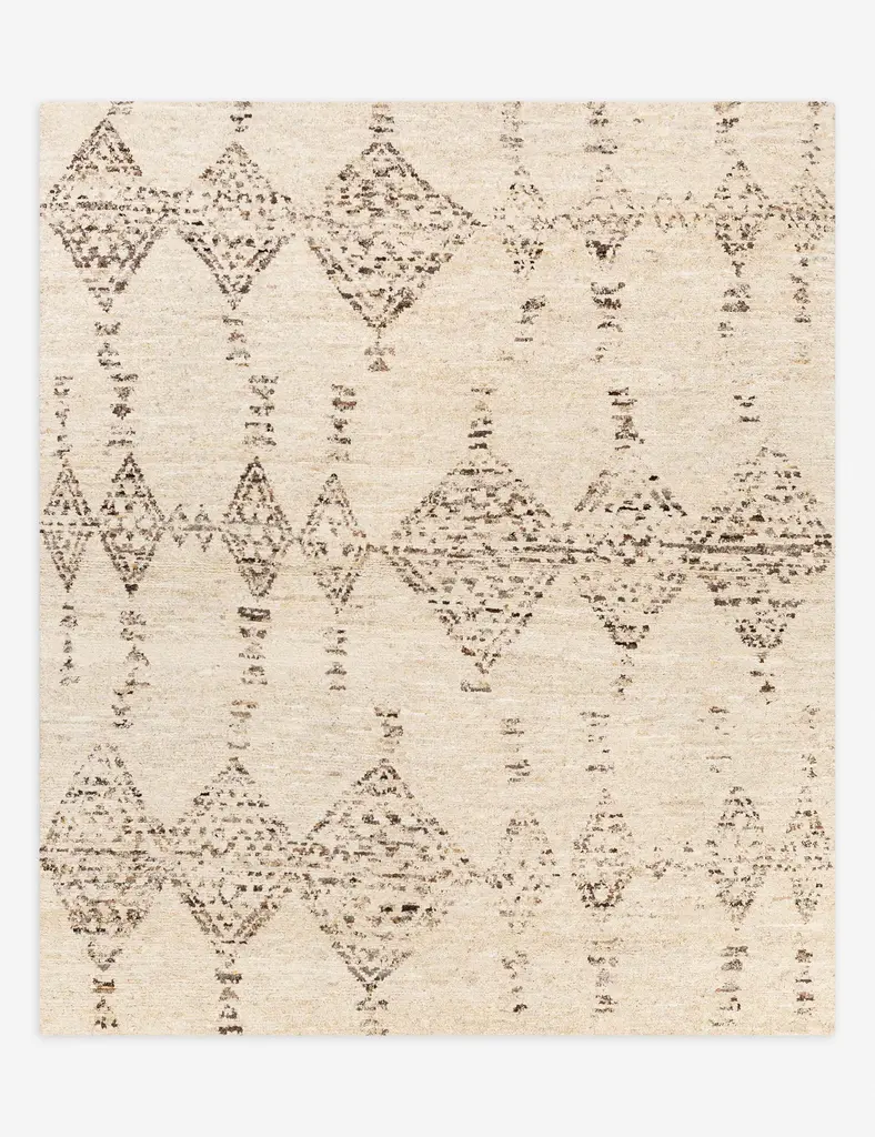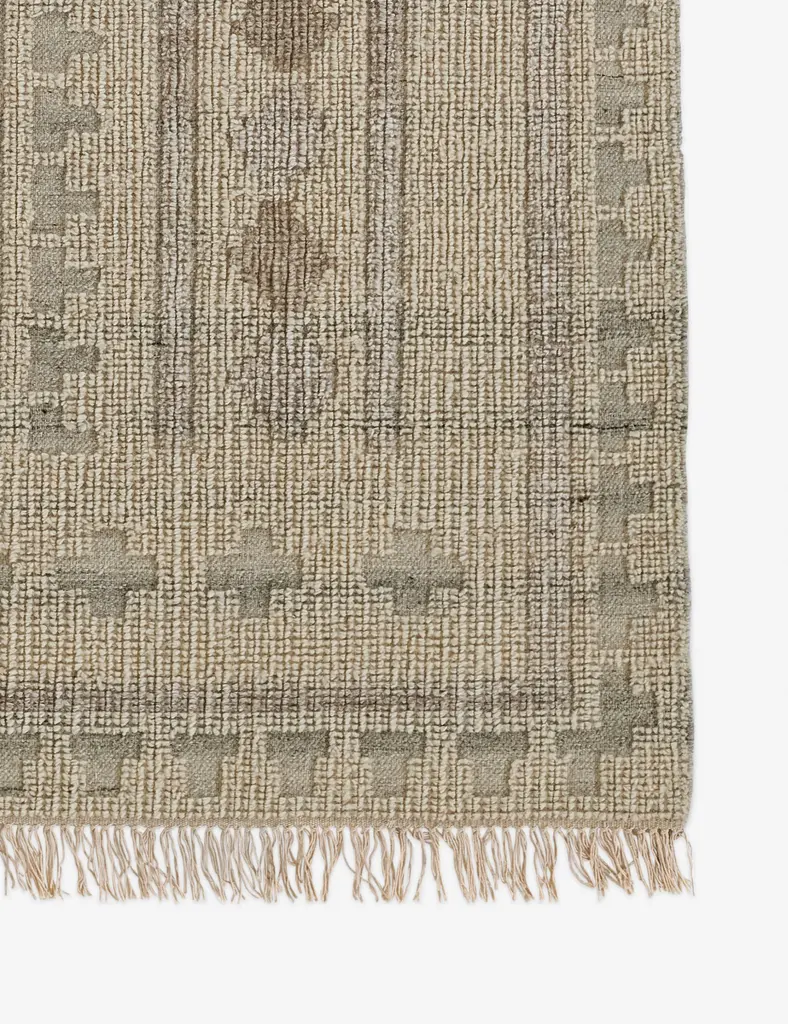The Baya rug grounds the room with the soft, tonal rhythm of its design. This handwoven rug seamlessly combines traditional elements with a modern flair, making it an ideal anchor for transitional decor. Its plush woolen pile and soft fringe offer an inviting elegance for casually curated spaces.
