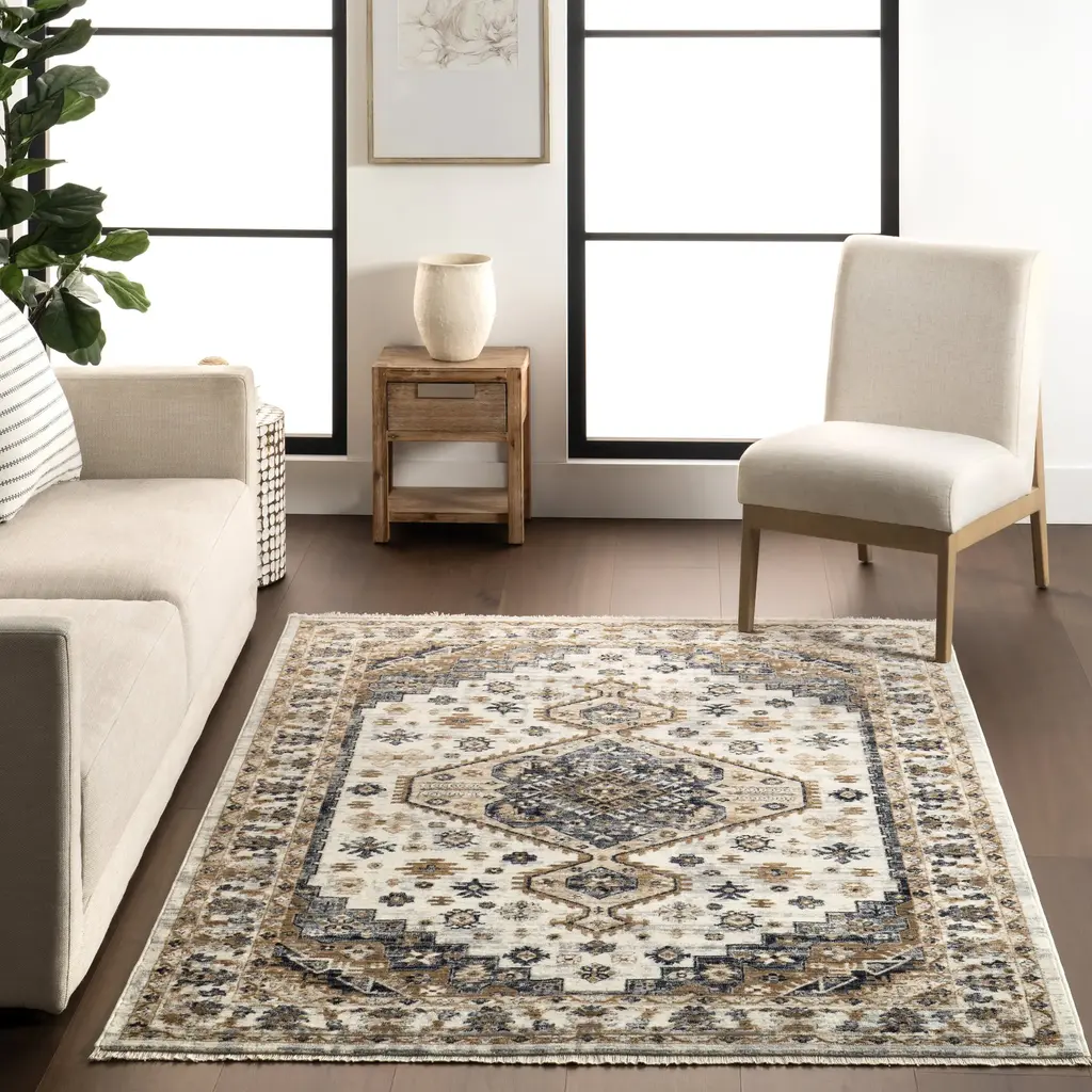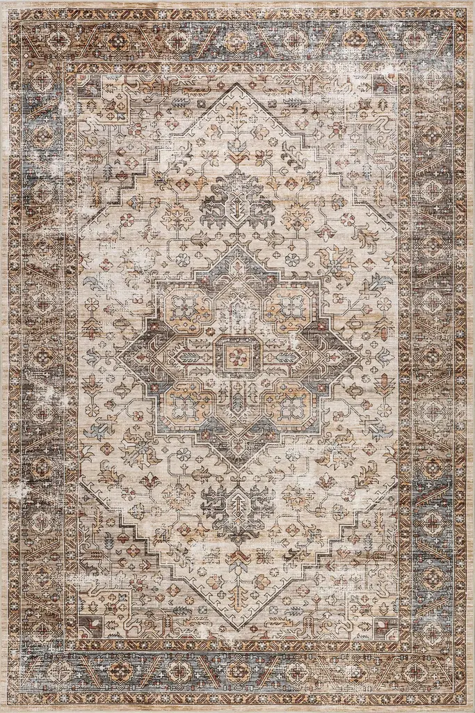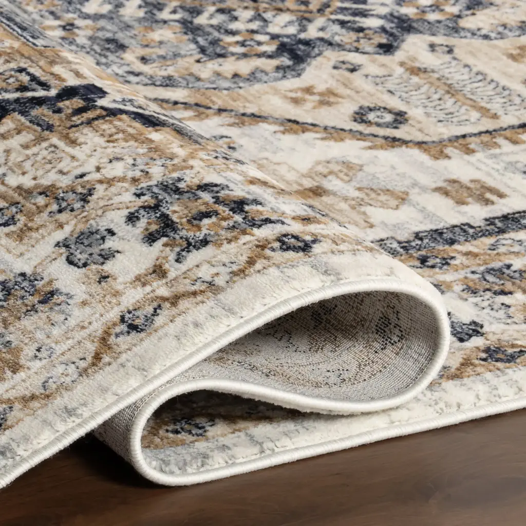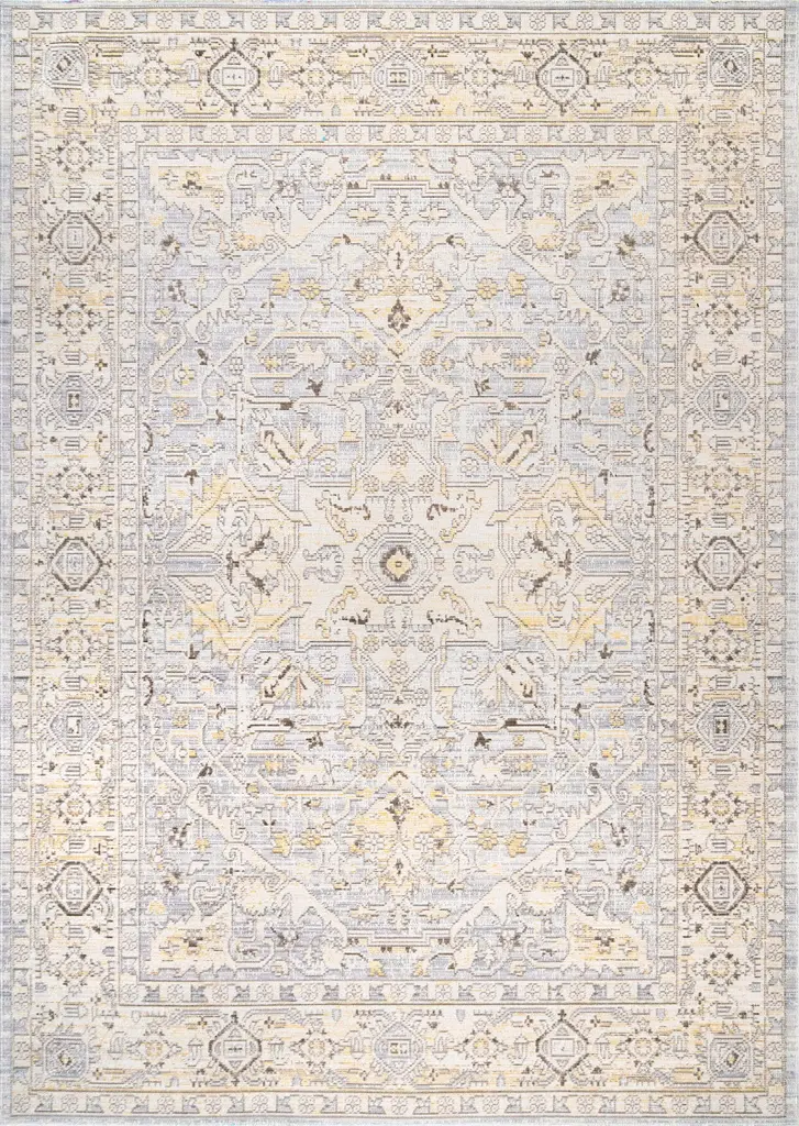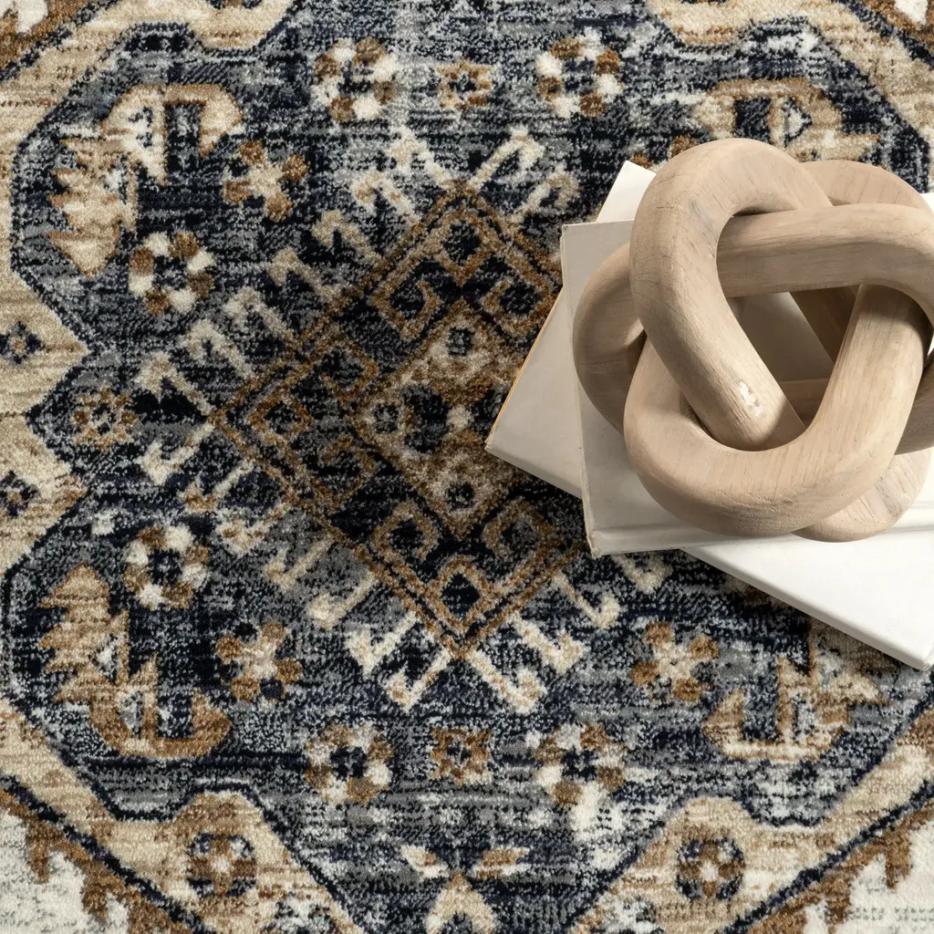 Bring a vintage rug-inspired centerpiece into your living space. Evoking designs of centuries past but made of modern, hard-wearing material, this rug will become a cherished part of the landscape of your home. A spin on a classic motif, this versatile floor covering will stand out with its contrasting details. Composed of durable synthetic fibers, this area rug feels incredibly soft under foot. These bold rugs are an easy way to incorporate the look of heirloom pieces, at affordable prices. Choose from an array of sizes and kick those feet up with our pet-friendly and easy to clean area rugs.