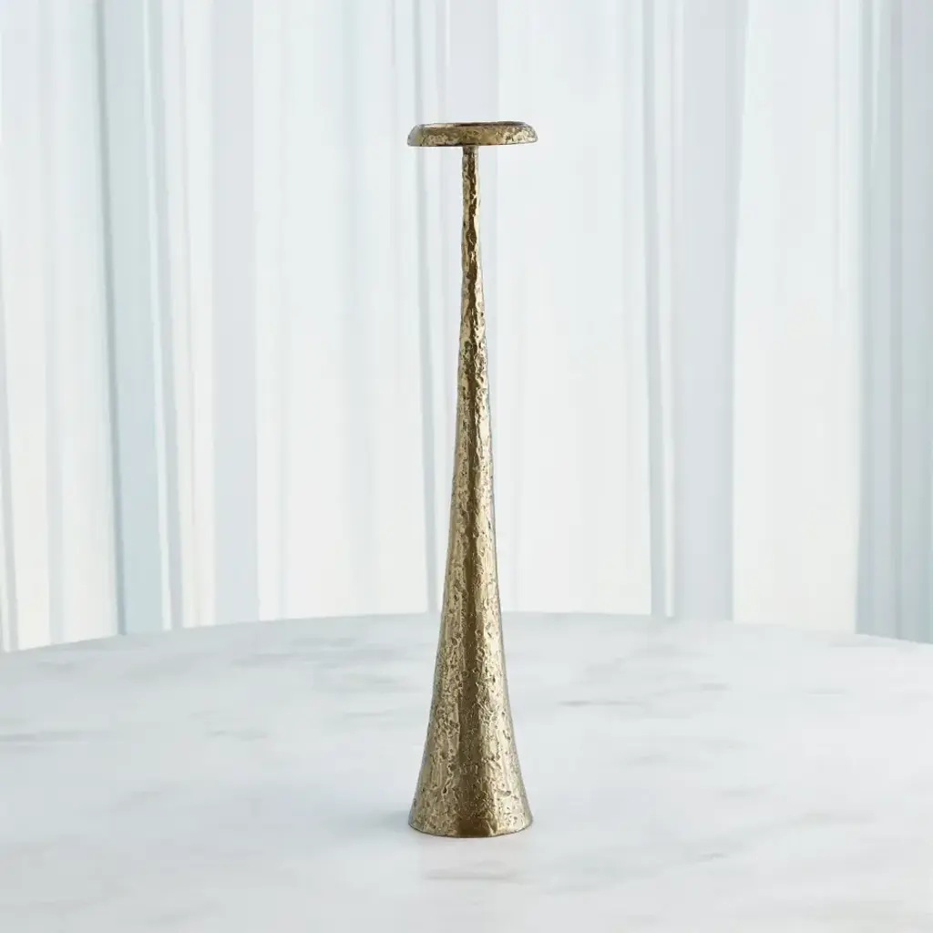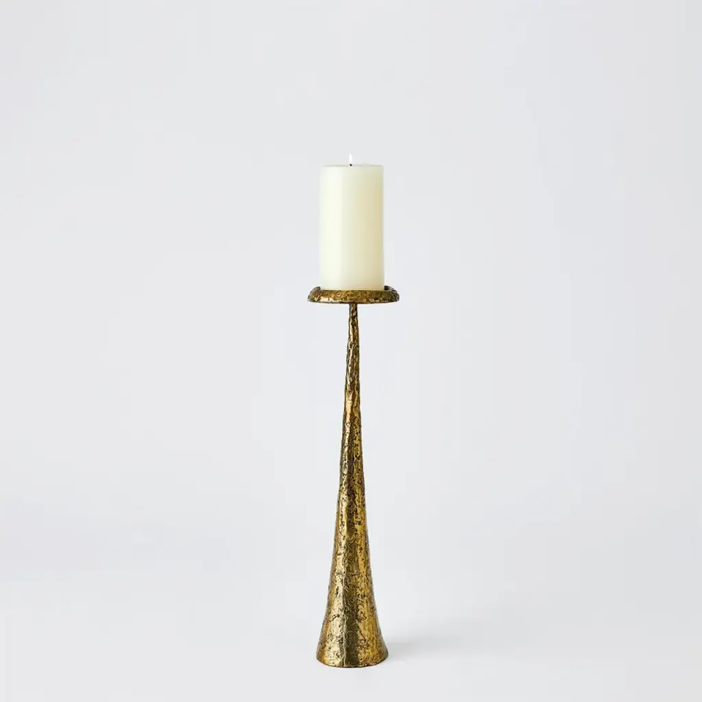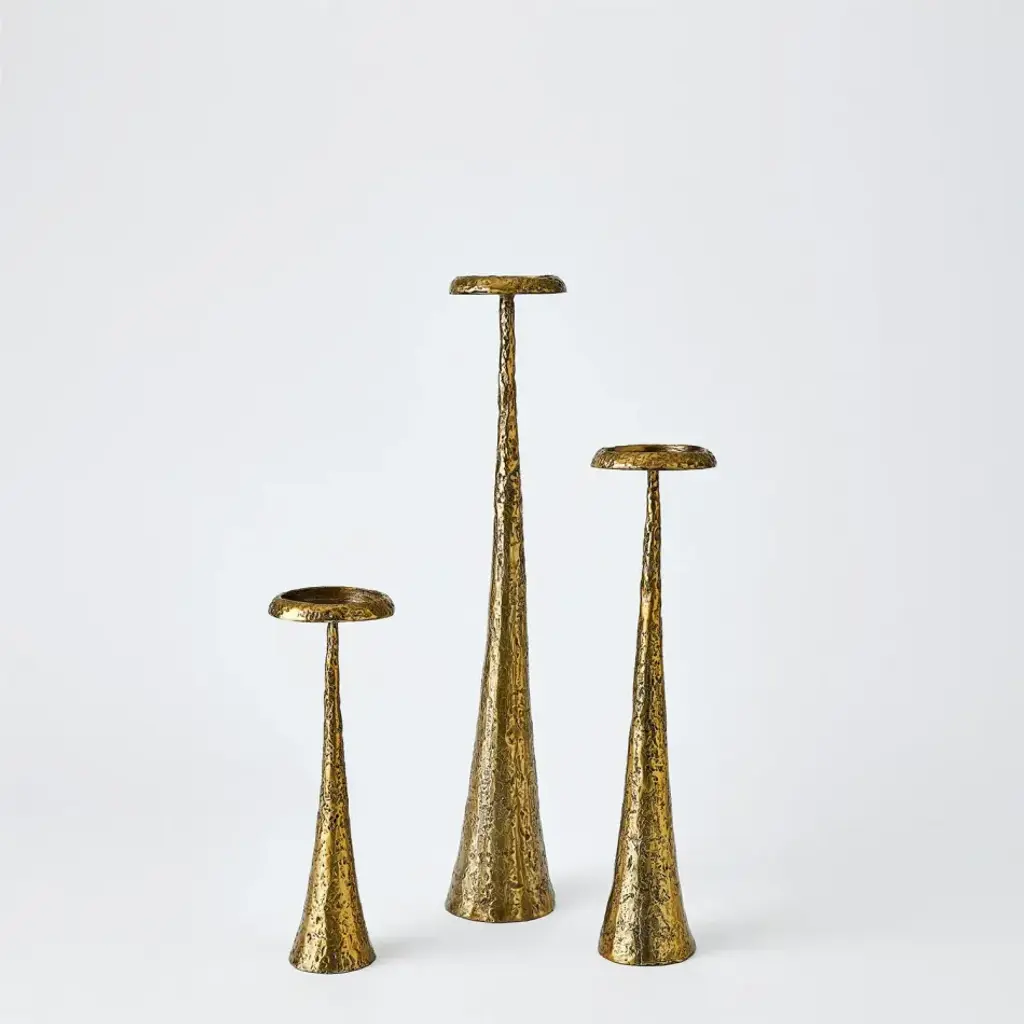 Uniquely tapered and textured finish, our Beacon Candle Holders are cast from iron and finished in antique brass. Offered in three sizes, each holding a 3ftDia. pillar candle From a fashion forward perspective, Global Views offers accessories, furniture, statement lighting, and an assortment of rugs and mirrors to add beauty and joy to your home.