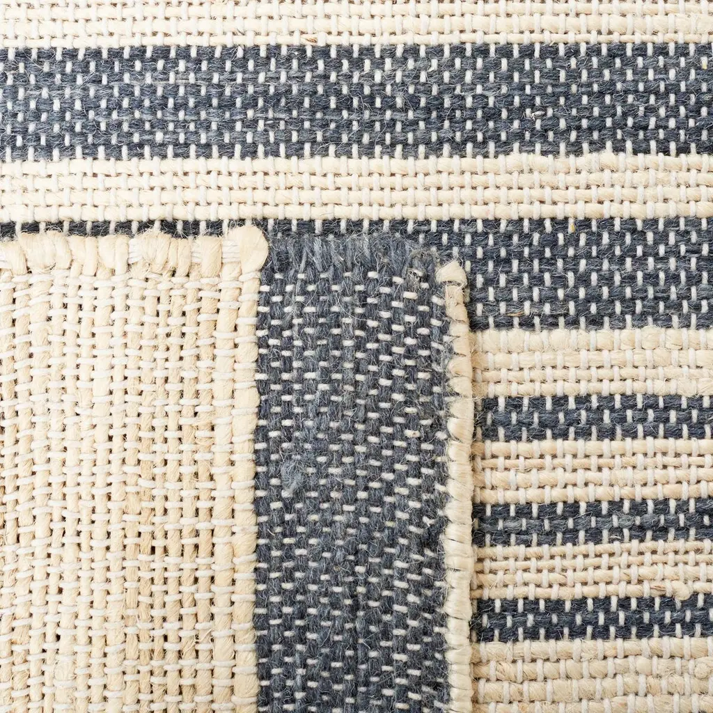 Discover elegance and durability in our hand-woven area rug, a versatile choice that brings a touch of contemporary style to any room. Crafted with a blend of 50% jute and 50% wool, this rug combines natural fibers for a balanced texture that is both soft and resilient. Made with meticulous care in India, this piece reflects a rich tradition of craftsmanship. Sized at a convenient 3' X 5', our small rectangle rug is an ideal addition to interiors where space is at a premium, allowing for easy placement in entries, beside a bed, or in a home office. The contemporary design, showcased in a harmonious ivory and charcoal color palette, features a stylish striped pattern that adds visual interest without overwhelming your decor. With a comfortable height of 1/4", this rug is both easy to maintain and perfect for high-traffic areas. The contemporary style seamlessly blends with modern, minimalist, or industrial decors, offering a subtle yet definitive statement. Whether you're refreshing an existing space or curating a new look, this area rug is sure to be the cornerstone of style and comfort in your home.