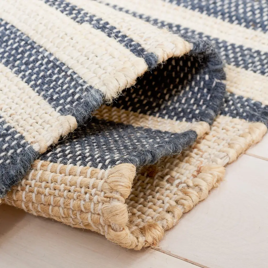 Discover elegance and durability in our hand-woven area rug, a versatile choice that brings a touch of contemporary style to any room. Crafted with a blend of 50% jute and 50% wool, this rug combines natural fibers for a balanced texture that is both soft and resilient. Made with meticulous care in India, this piece reflects a rich tradition of craftsmanship. Sized at a convenient 3' X 5', our small rectangle rug is an ideal addition to interiors where space is at a premium, allowing for easy placement in entries, beside a bed, or in a home office. The contemporary design, showcased in a harmonious ivory and charcoal color palette, features a stylish striped pattern that adds visual interest without overwhelming your decor. With a comfortable height of 1/4", this rug is both easy to maintain and perfect for high-traffic areas. The contemporary style seamlessly blends with modern, minimalist, or industrial decors, offering a subtle yet definitive statement. Whether you're refreshing an existing space or curating a new look, this area rug is sure to be the cornerstone of style and comfort in your home.