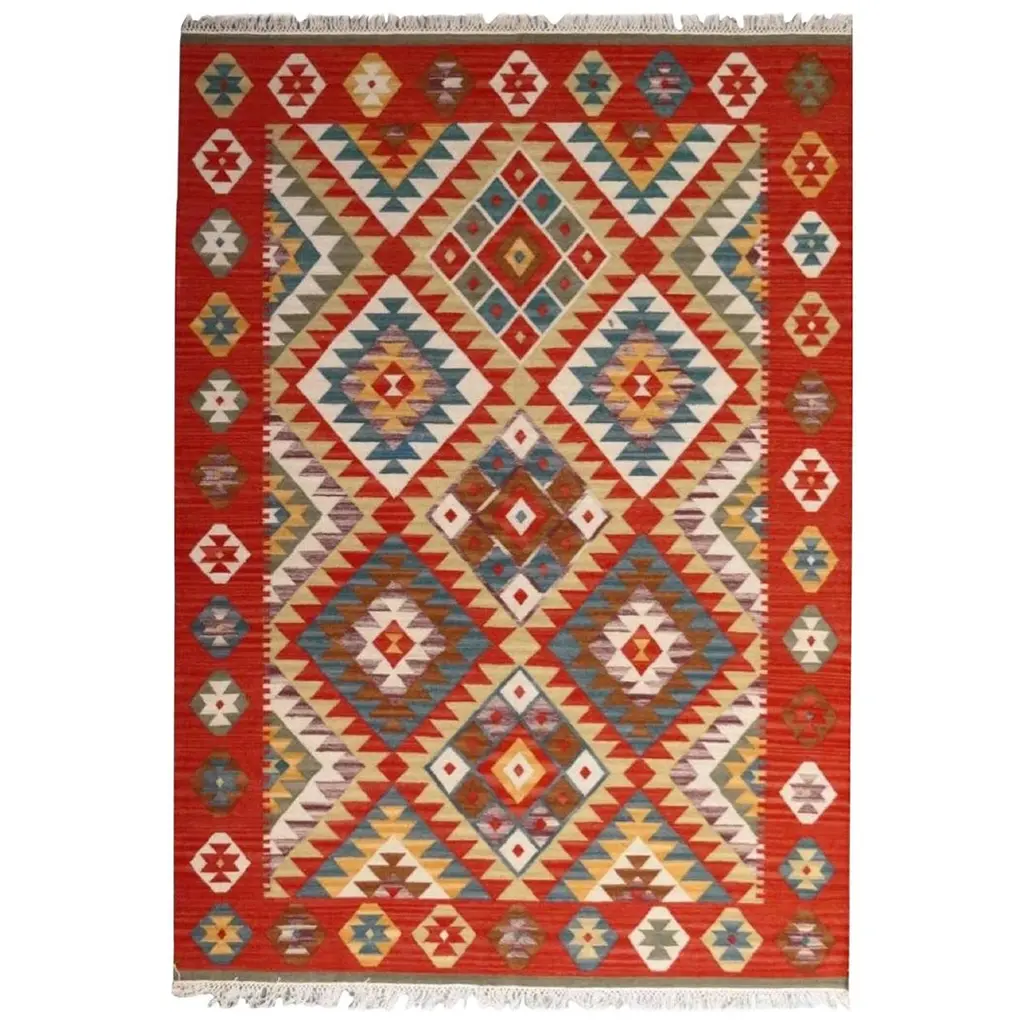 Nice new Kilim with beautiful geometrical design of Turkish Kilims and nice colors, entirely handwoven with wool on cotton foundation. Size: 170 x 240 cm, 5ft 7in x 7ft 10in.