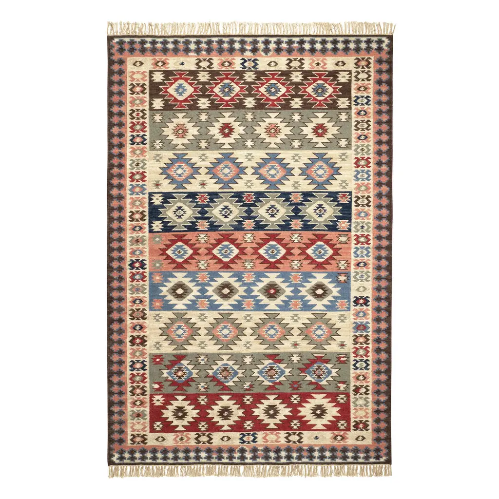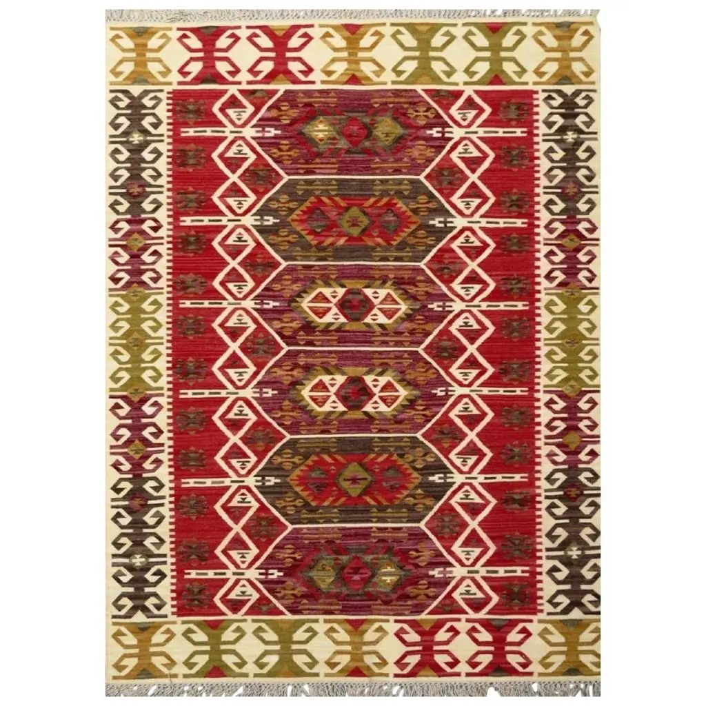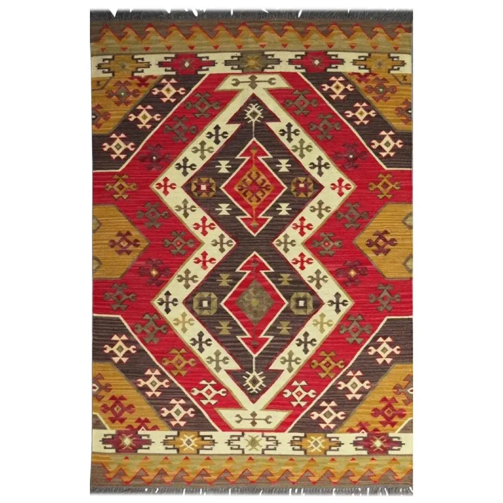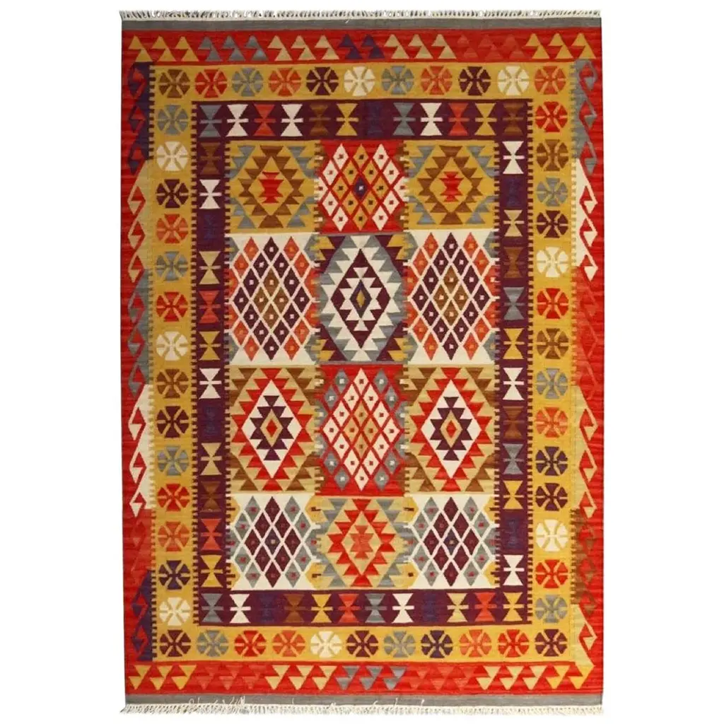 Nice new Kilim with beautiful geometrical design of Turkish Kilims and nice colors, entirely handwoven with wool on cotton foundation. Measures: 170 x 240 cm.