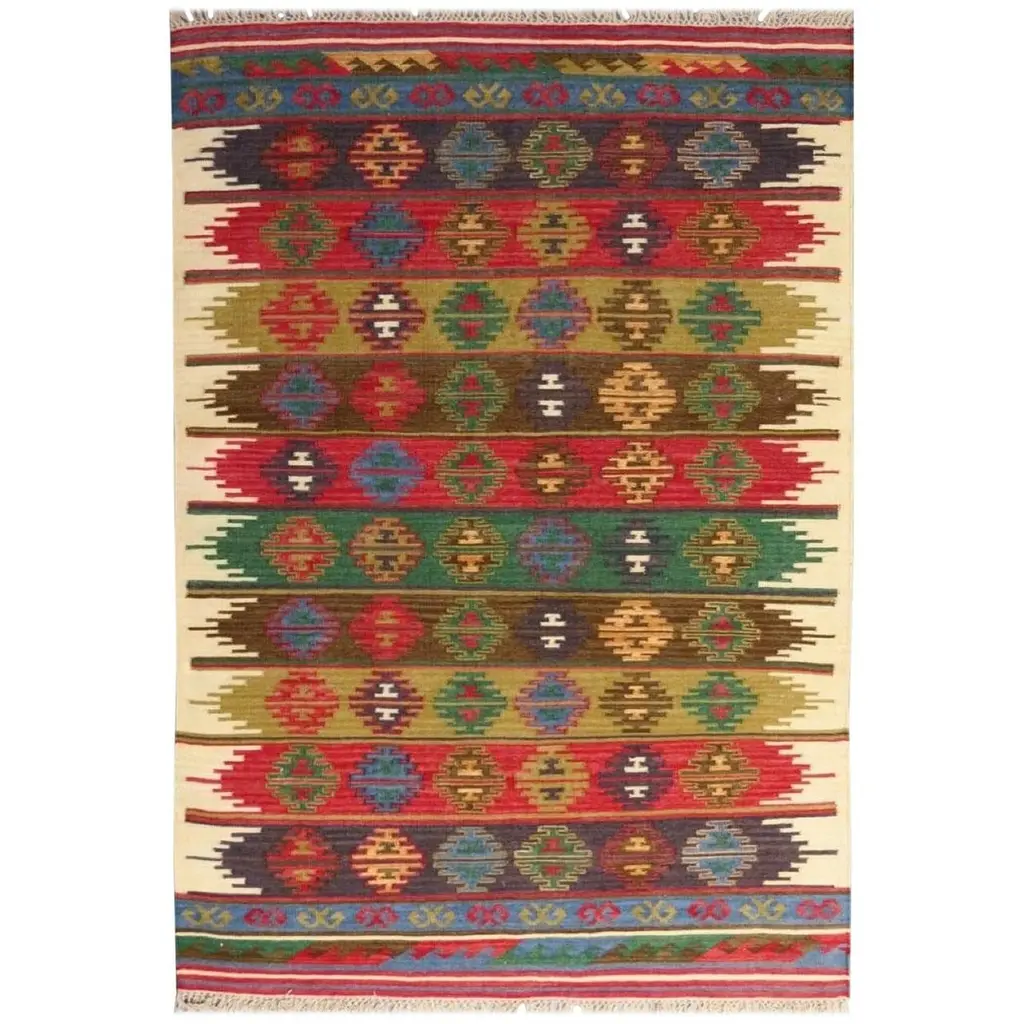 Nice new Kilim with beautiful geometrical design of Turkish Kilims and nice colors, entirely handwoven with wool on cotton foundation. Measures: 170 x 240 cm.