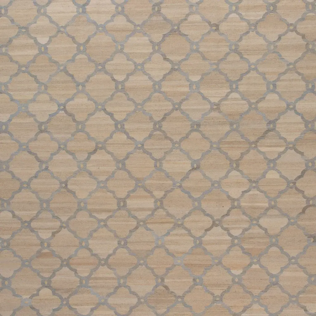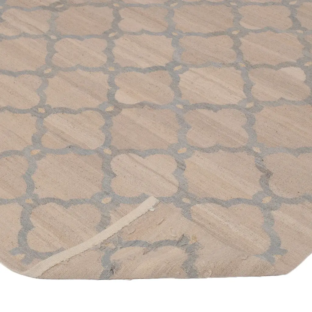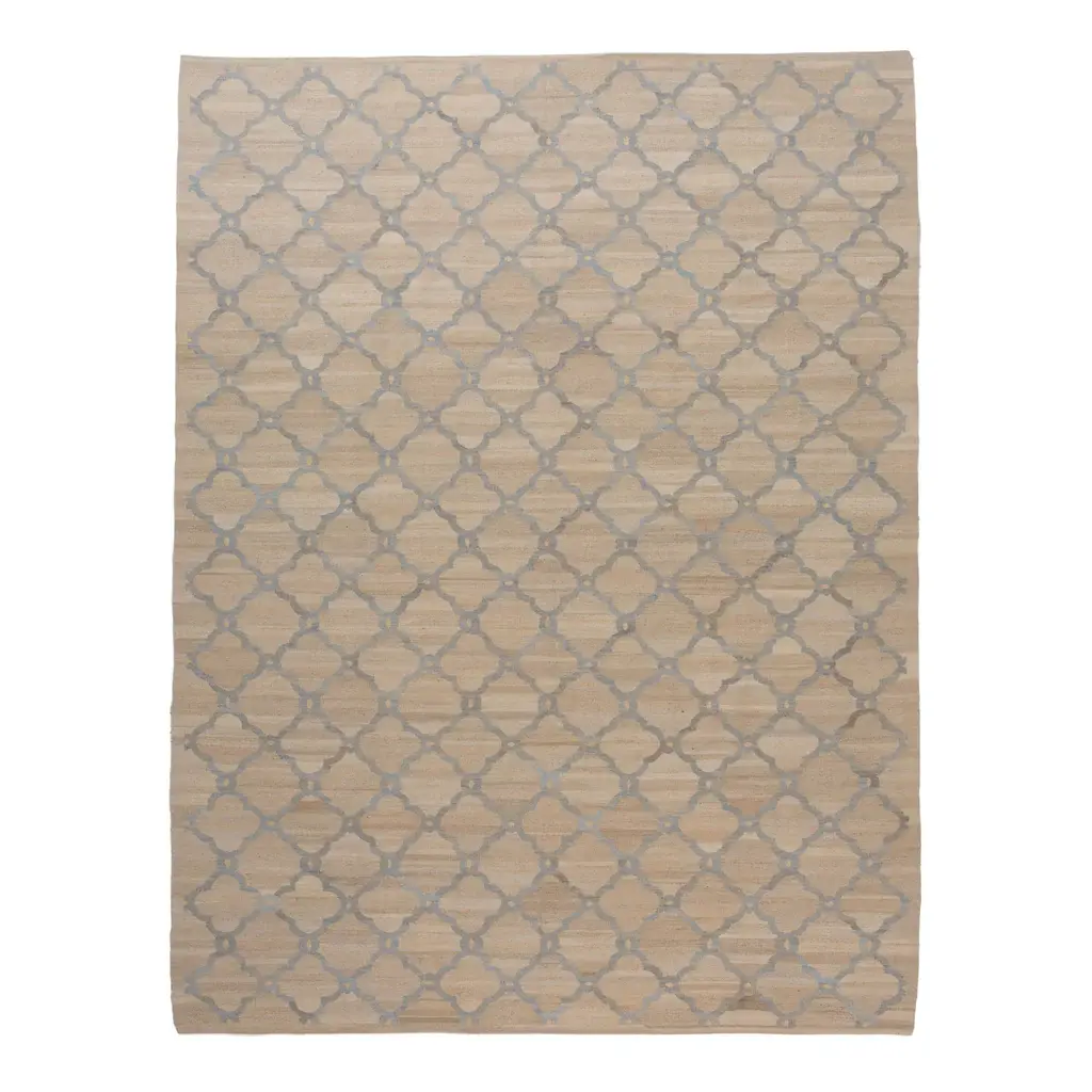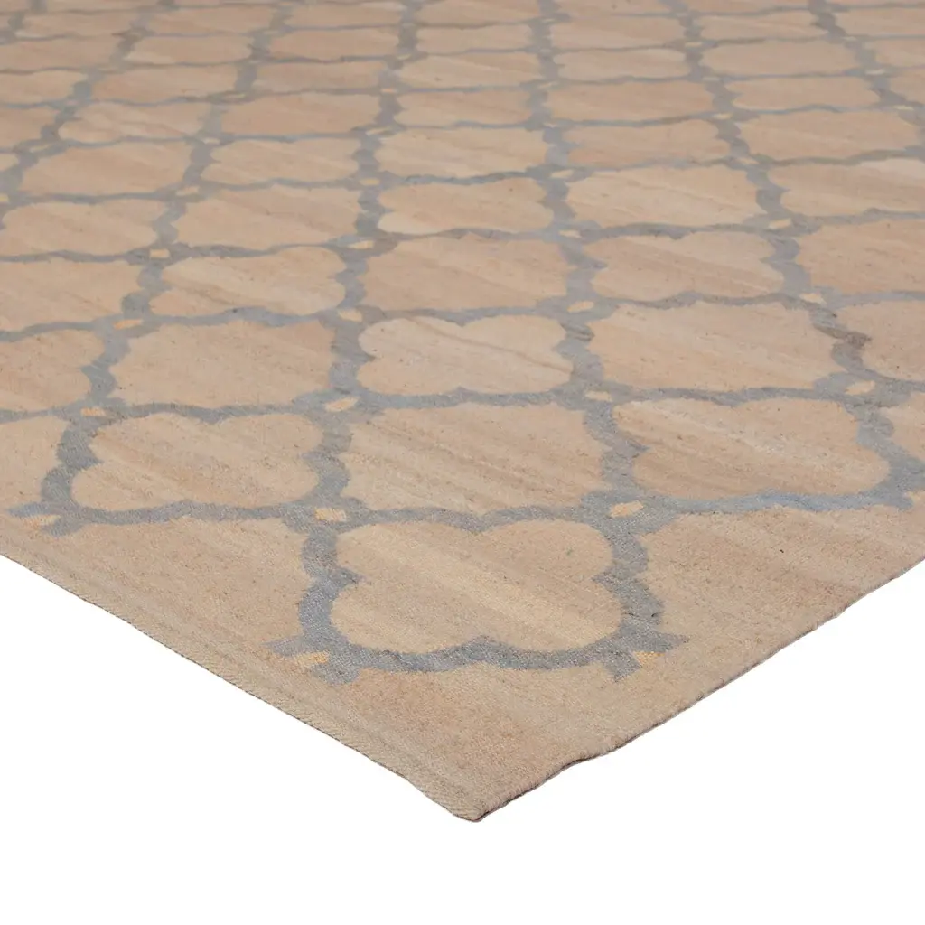 A striated, neutral field provides a compelling backdrop to the allover pattern of steel gray quatrefoil motifs on this flat weave rug. Handwoven from wool, it will be a compelling visual statement for the modern interior.