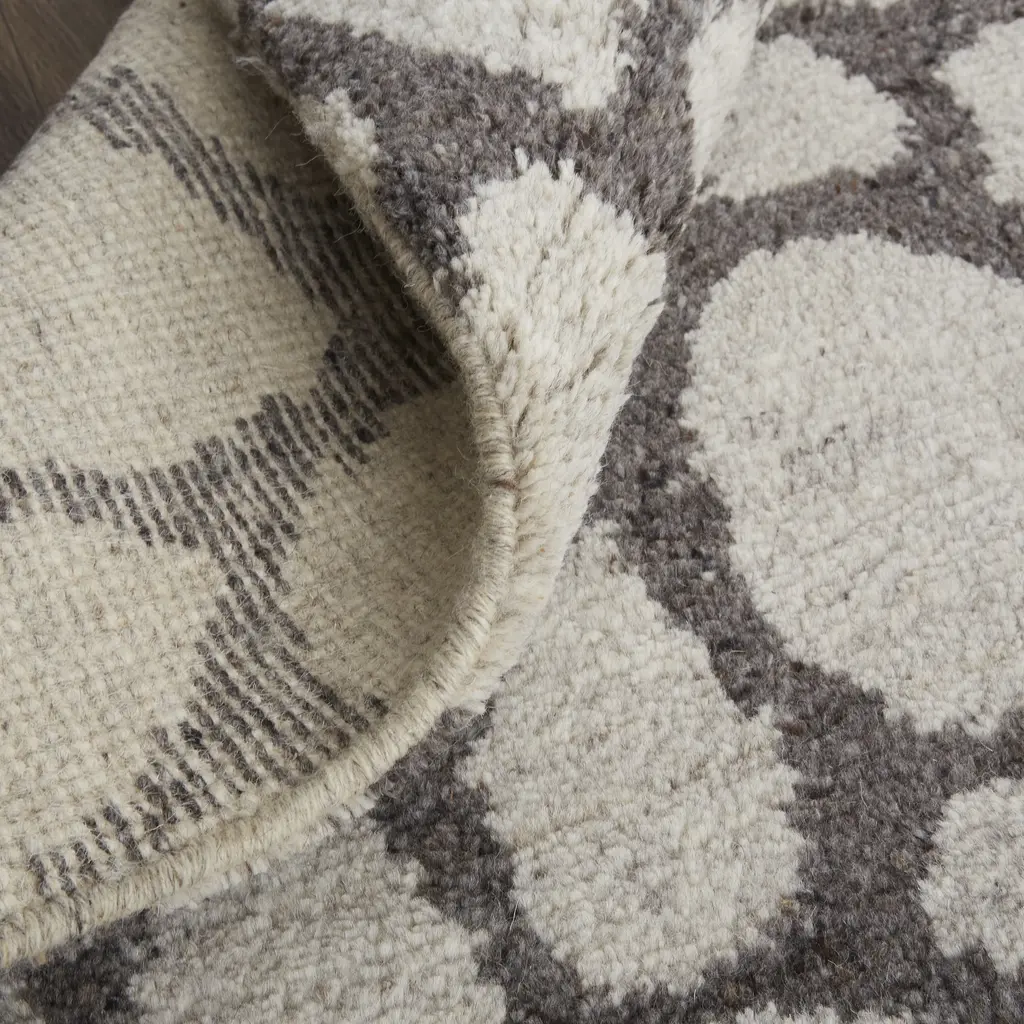 Collection: Belden Colors: Ivory, Gray Construction: Hand Knotted Material: Face: 100%Wool Pile: High Pile Pile Height: 1.49" Styles: Transitional,Casual,Farmhouse Backing: N/A Made In: India Thickness: 1.49" Price Range: $$$$$ (Premium)