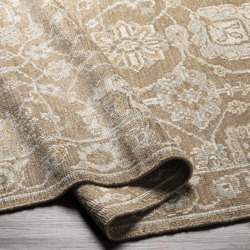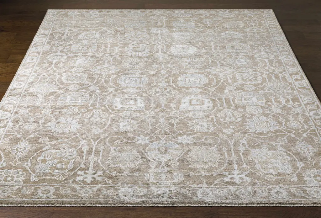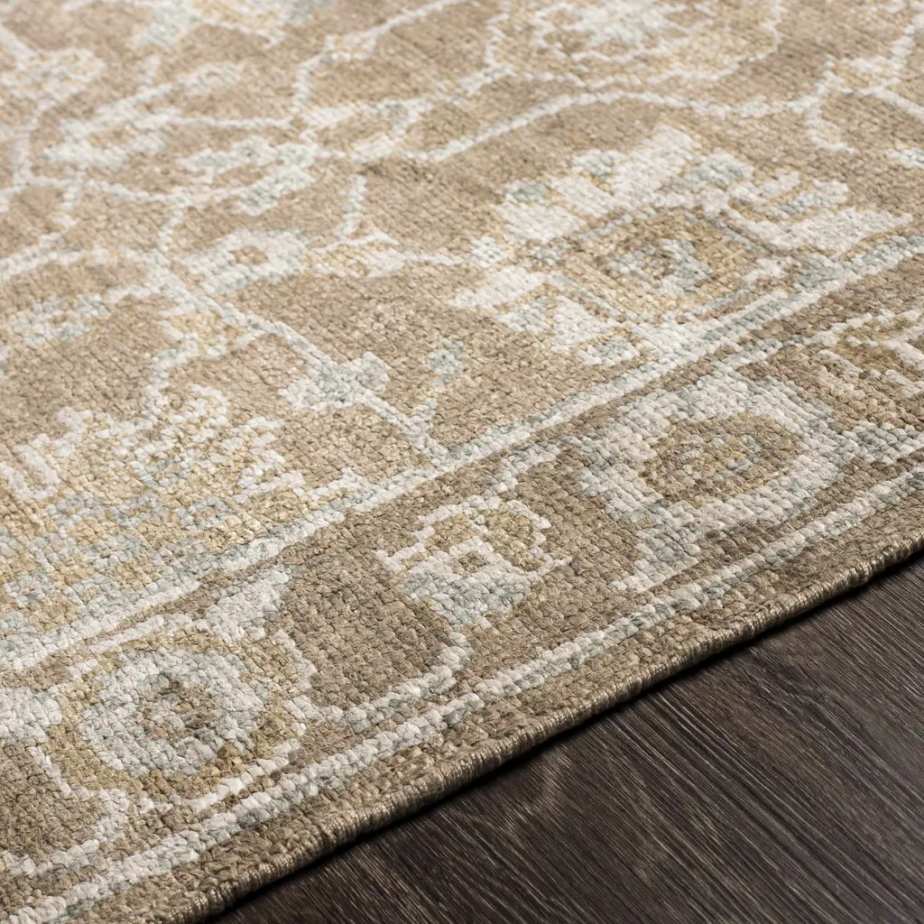 Collection: Beldon Colors: Gray, Taupe, Blue, Beige Construction: Hand Knotted Material: 100% Viscose Pile: Low Pile Pile Height: 0.15" Styles: Traditional Made In: India Thickness: 0.15" Fringe Length: 0.5" Price Range: $$$$$ (Premium)