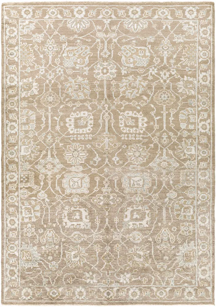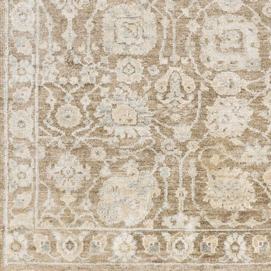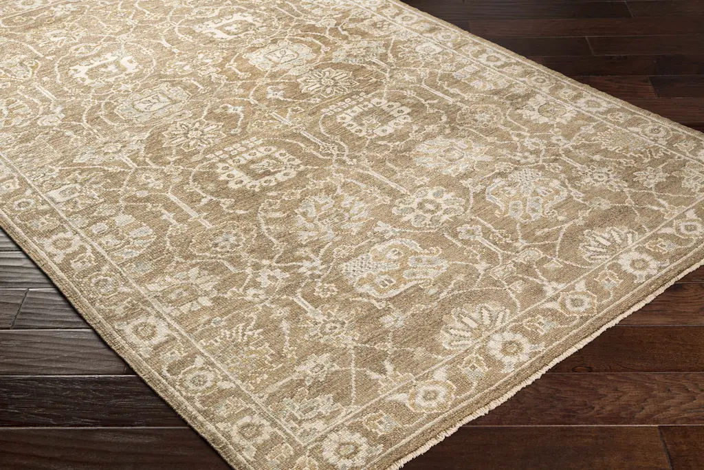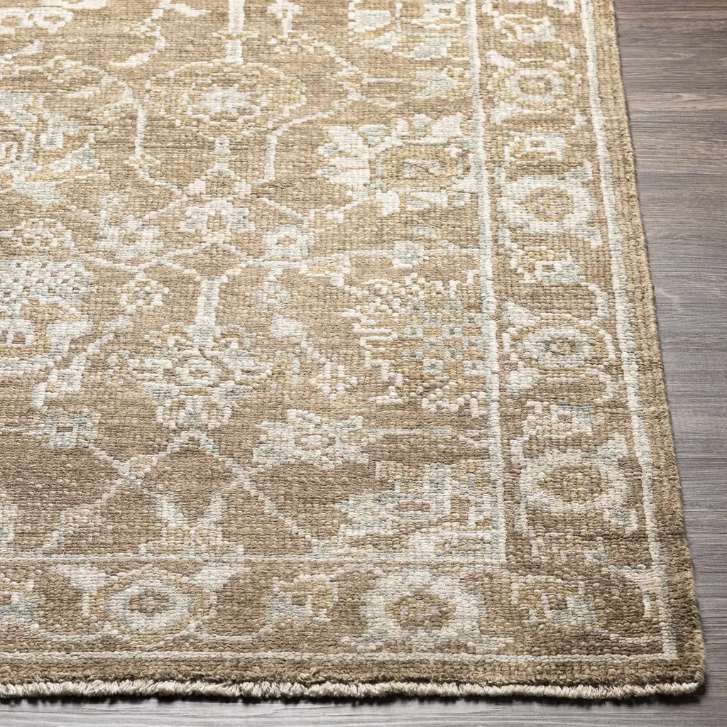 Collection: Beldon Colors: Gray, Taupe, Blue, Beige Construction: Hand Knotted Material: 100% Viscose Pile: Low Pile Pile Height: 0.15" Styles: Traditional Made In: India Thickness: 0.15" Fringe Length: 0.5" Price Range: $$$$$ (Premium)