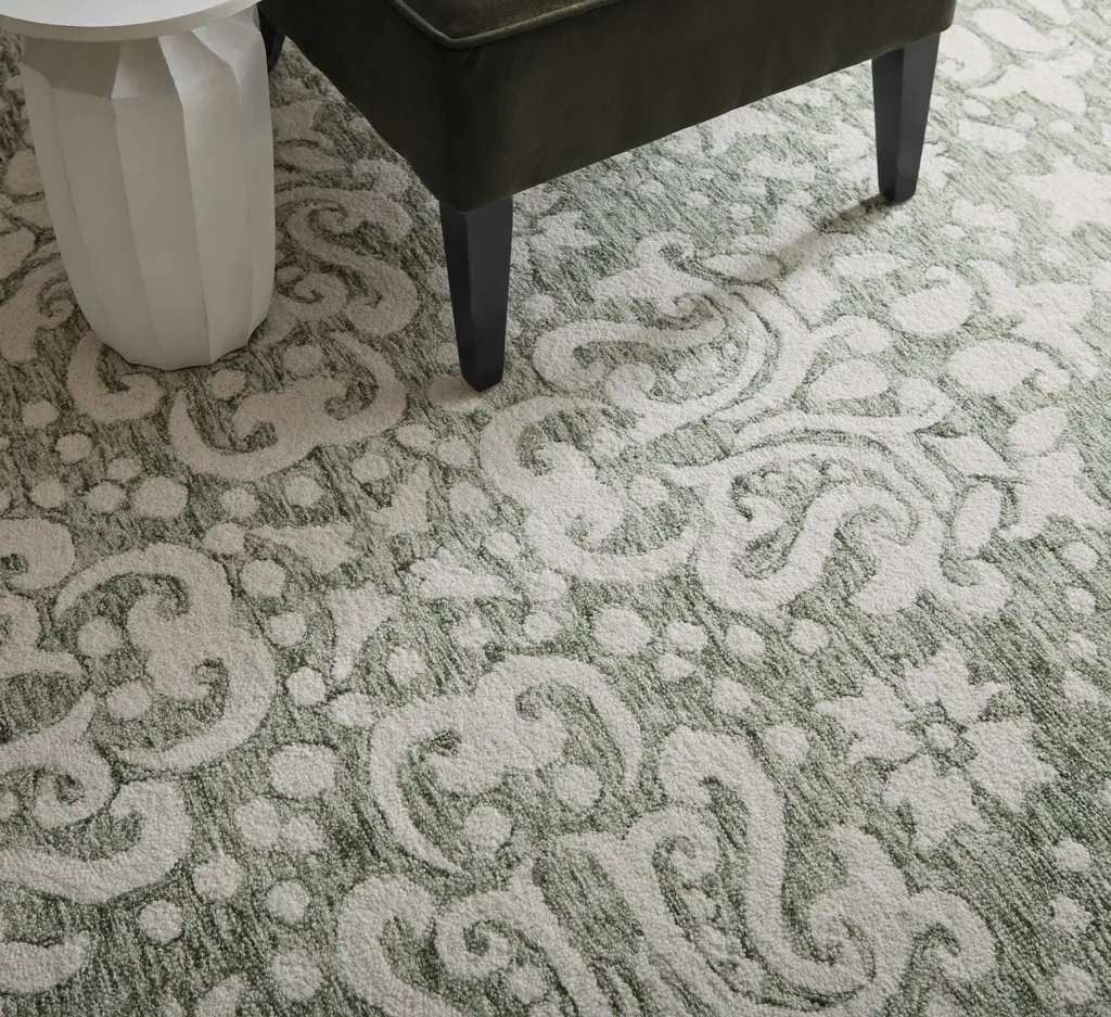 Collection: Belfort Colors: Ivory, Green Construction: Hand Tufted Material: Face: 100%Wool / Warp: Cotton Pile: Low Pile Pile Height: 0.5" Styles: Traditional,Vintage,Casual Backing: Cotton Made In: India Thickness: 0.5" Price Range: $$$$$ (Affordable)
