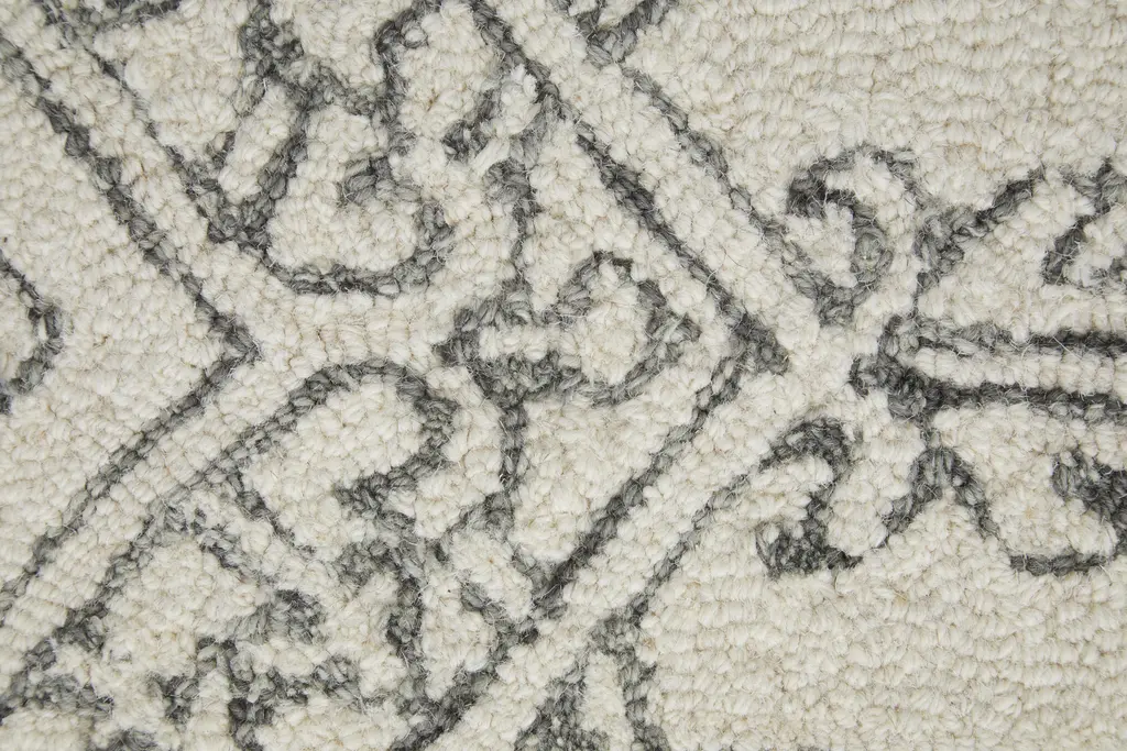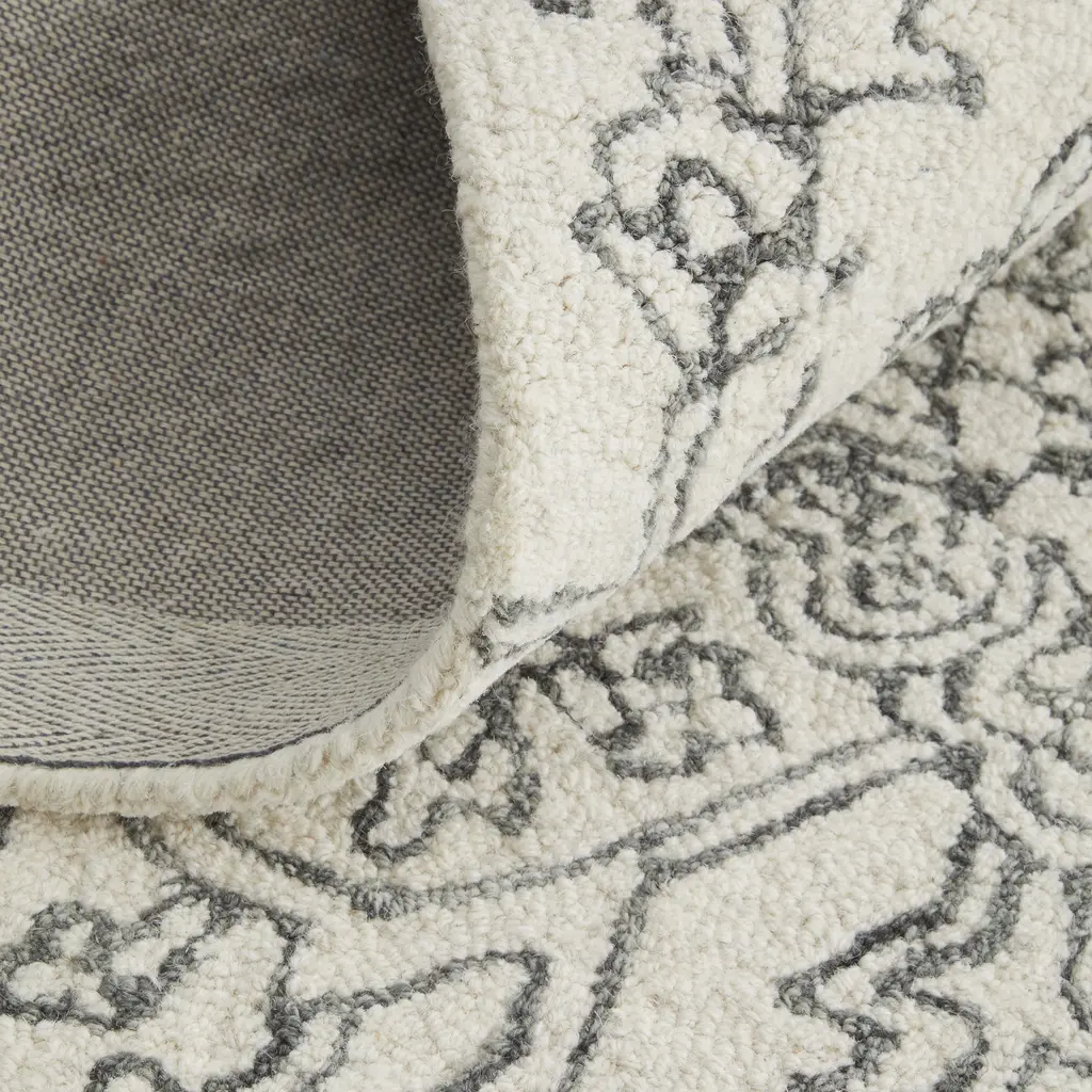 Collection: Belfort Colors: White, Gray Construction: Hand Tufted Material: Face: 100%Wool / Warp: Cotton Pile: Low Pile Pile Height: 0.5" Styles: Transitional,Vintage,Traditional Backing: Cotton Made In: India Thickness: 0.5" Price Range: $$$$$ (Affordable)