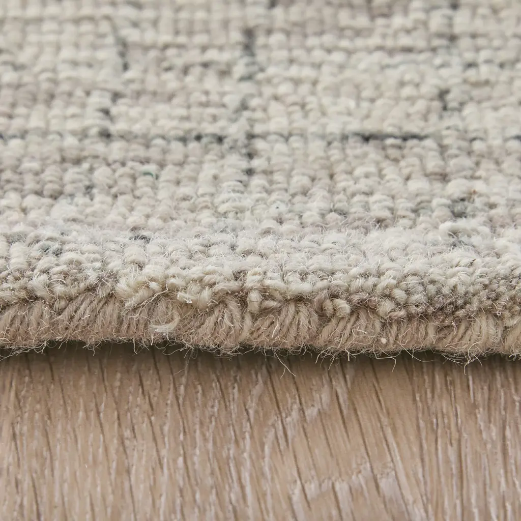 Collection: Belfort Colors: Ivory, Gray, Taupe Construction: Hand Tufted Material: Face: 100%Wool / Warp: Cotton Pile: Low Pile Pile Height: 0.5" Styles: Transitional,Casual,Scandinavian Backing: Cotton Made In: India Thickness: 0.5" Price Range: $$$$$ (Affordable)