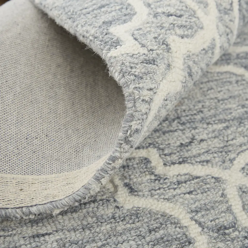 Collection: Belfort Colors: Blue, Gray, Ivory Construction: Hand Tufted Material: Face: 100%Wool / Warp: Cotton Pile: Low Pile Pile Height: 0.5" Styles: Transitional,Traditional,Moroccan Backing: Cotton Made In: India Thickness: 0.5" Price Range: $$$$$ (Affordable)