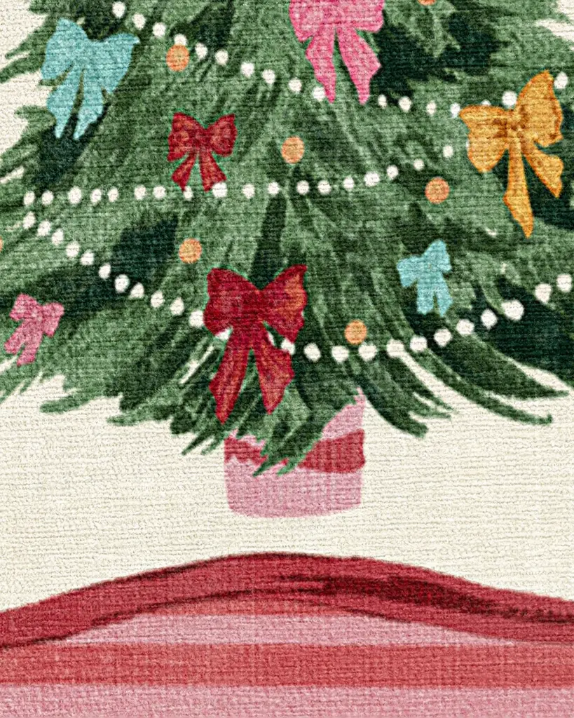 Add a bow (or several) to your holiday floor decor. The Bella Bows Multicolor Rug is riddled with unapologetic festivity, standing out as a seasonal statement piece. Decorate for the holidays with the perfect adornment of vibrant hues juxtaposed against a bold Christmas tree backdrop. Water-resistant, stain-resistant, and fully machine-washable. Colors may vary by device and lighting.