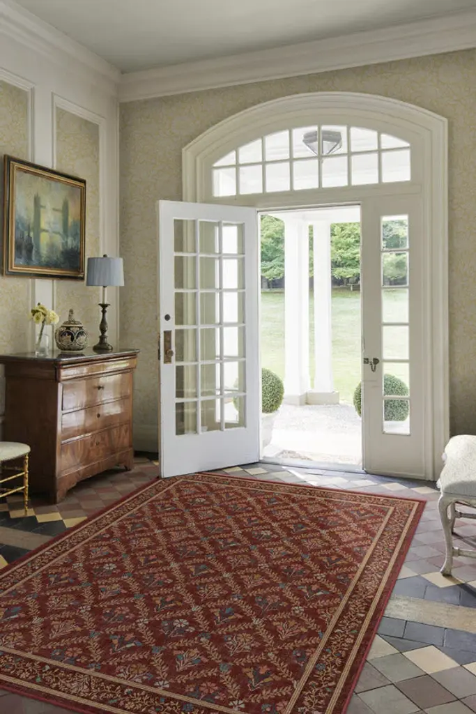 Gaze at the organic beauty of the Morris & Co. Bellflowers Amber Red Rug. Our interpretation of William Morris's famed carpet design from the late 1800s, this rug boasts a beautiful lattice vine design and delicate bouquets that evoke the promise of spring. A harmonious border of floral buds and leaves frames the design in intricate detail. Rich red grounds the design, while softened pops of coral, yellow, and blue make it sing. Water-resistant, stain-resistant, and machine-washable. Rug colors may vary slightly according to your device and the lighting in your space.