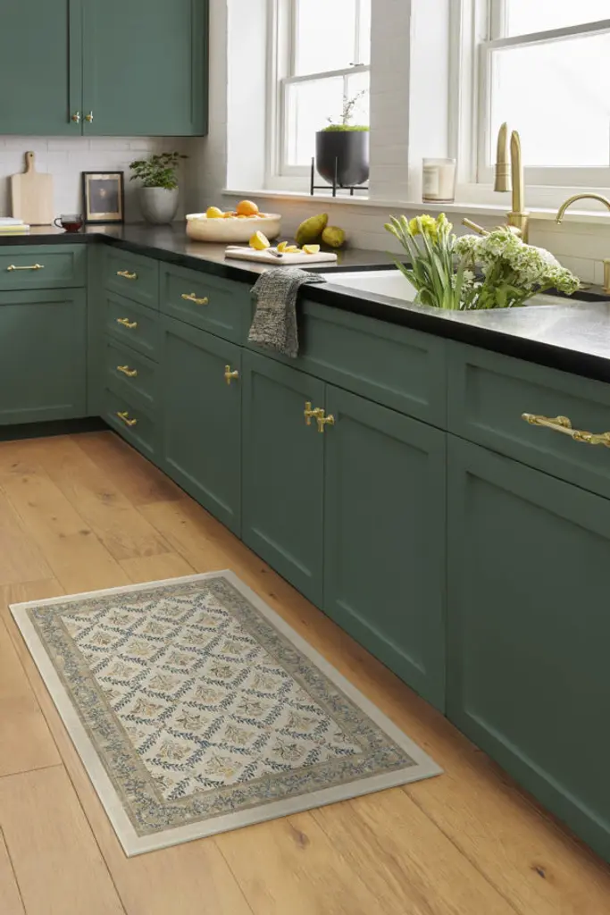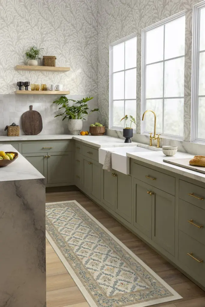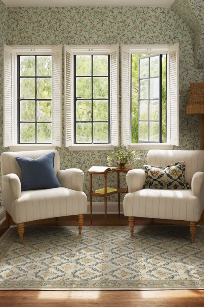 Gaze at the organic beauty of the Morris & Co. Bellflowers Ivory & Gold Rug. Our interpretation of William Morris's famed carpet design from the late 1800s, this rug boasts a beautiful lattice vine design and delicate bouquets that evoke the promise of spring. A harmonious border of floral buds and leaves frames the design in intricate detail. Neutral ivory and golden cream contrast with soft navy, and olive for balanced warmth that sings with accents of yellow and taupe. Water-resistant, stain-resistant, and machine-washable. Rug colors may vary slightly according to your device and the lighting in your space.